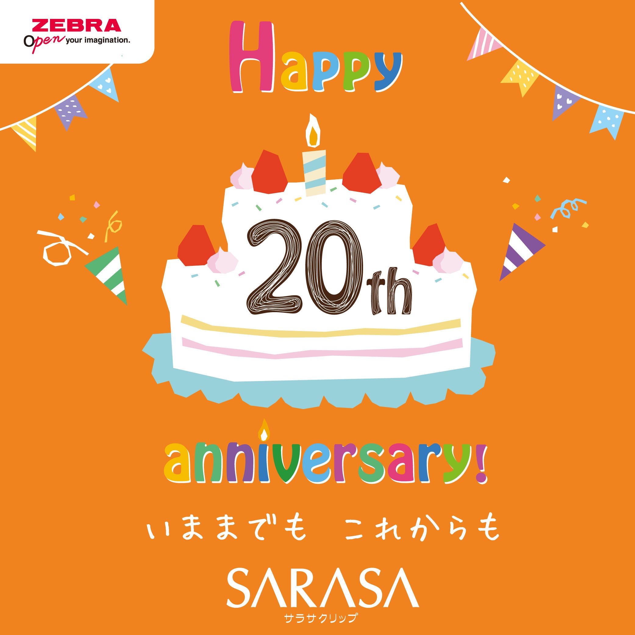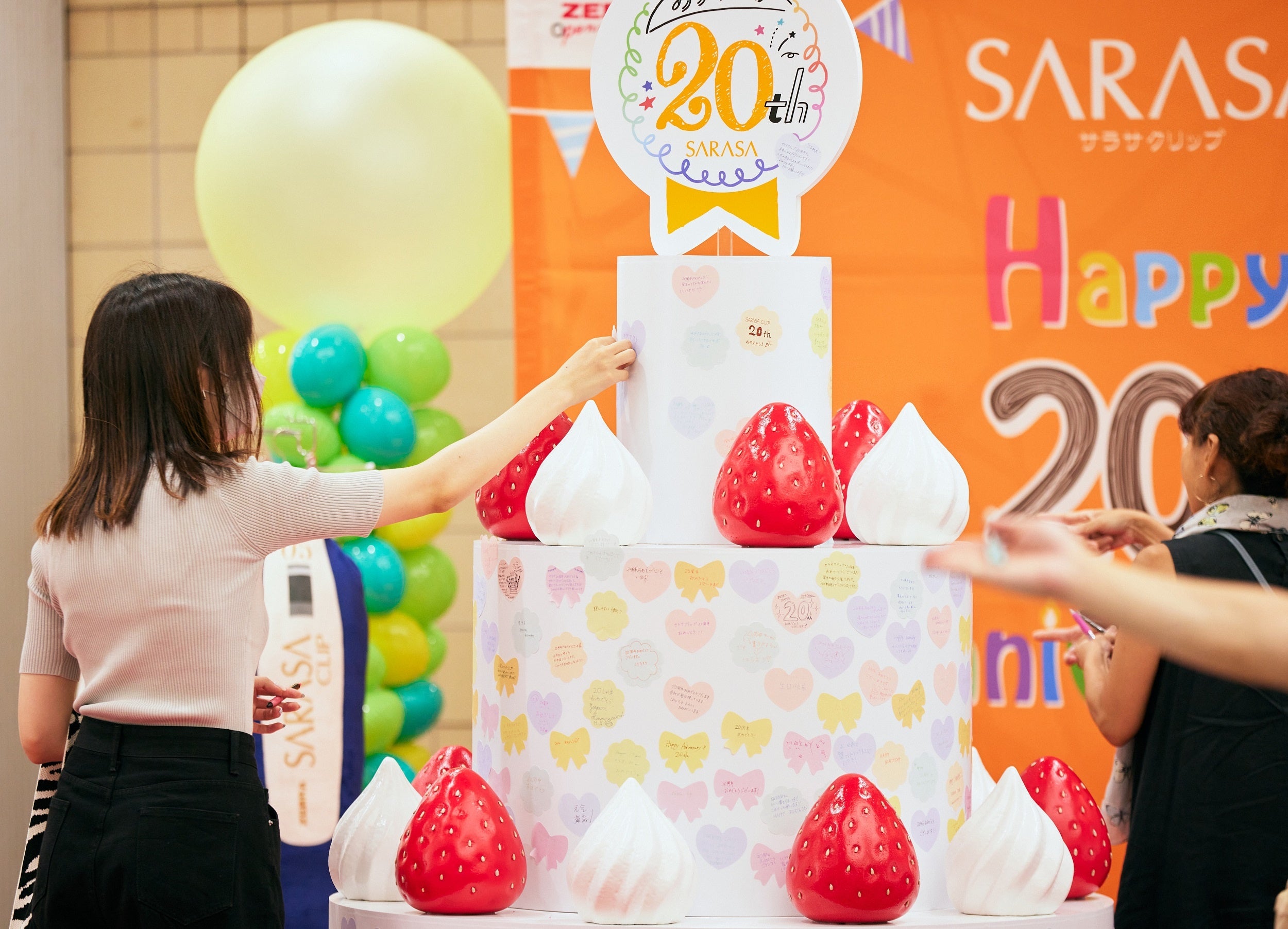 サラサクリップ発売20周年を祝うイベントスペースが渋谷マークシティ マークイベントスクエアに登場。「Happy 20th anniversary!」というメッセージと共に巨大なケーキのオブジェが出現。会場では20周年限定のサラサクリップを来場者に無料でプレゼントし、それを使ってメッセージカードを書いてもらい、巨大ケーキに貼り付けながらサラサクリップの20周年を一緒にお祝いしました。また、20周年限定商品も展示。ご覧になる人がいたほか、「小学校の頃から使っている。サラサの書き心地が好き!」、「季節に合わせて色々な色を使っている」、「手紙をよくサラサで書いている!」、「サラサと同じ20歳!これからも毎日使います」と話す人がいるなど、会場はお祝いムードに包まれました。
