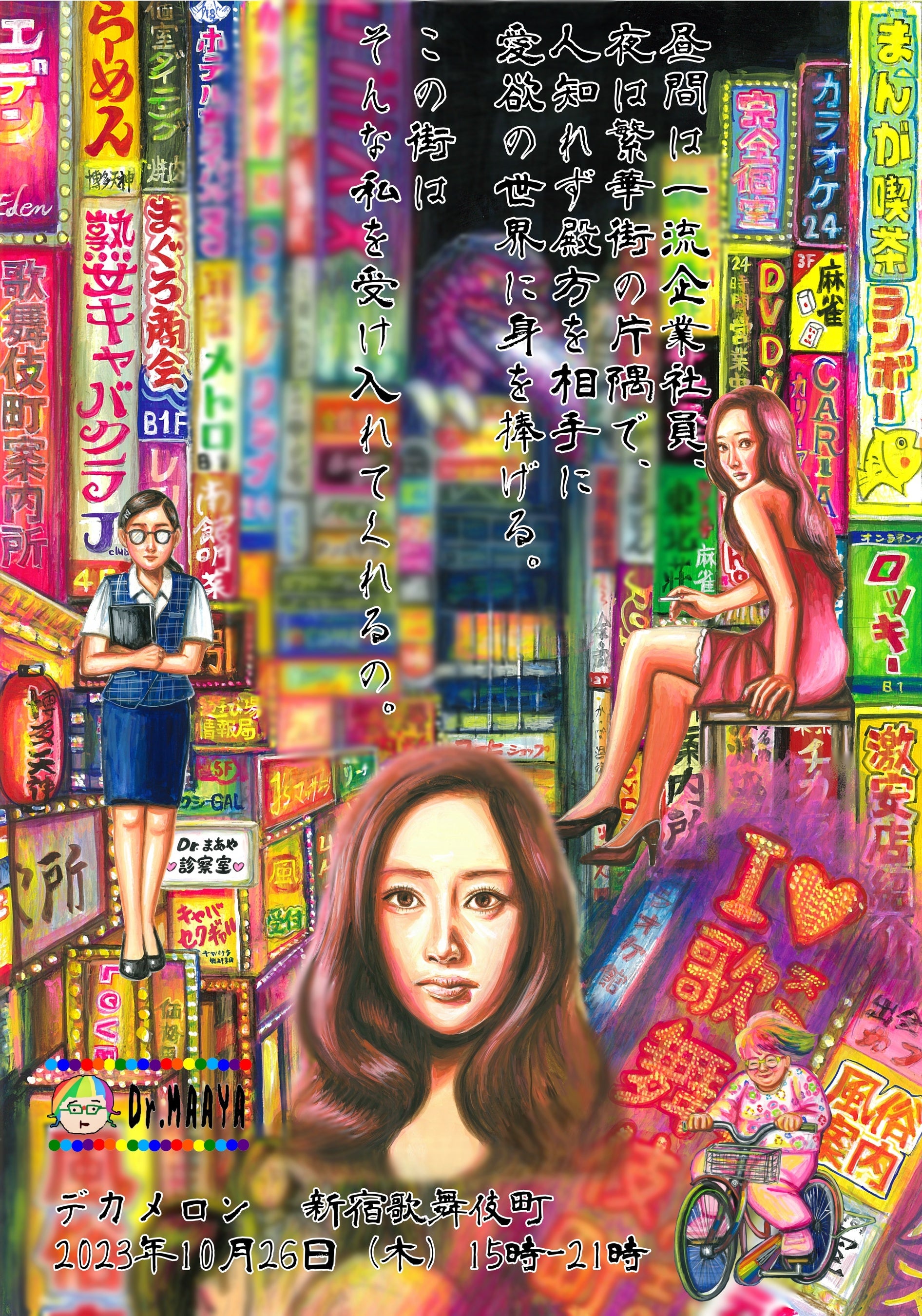 吉岡里奈氏のイラストが描き出す昭和の官能美を放つ女性たちが、新宿の賑やかな街を舞台に活き活きと躍動します。昼と夜、二重生活を送るOLから夜の蝶と化す女性、サラリーマンからキャバ嬢、客引き、ヤクザ、ゴスロリ女性まで、新宿の多様な住人たちの物語が展開されました。
