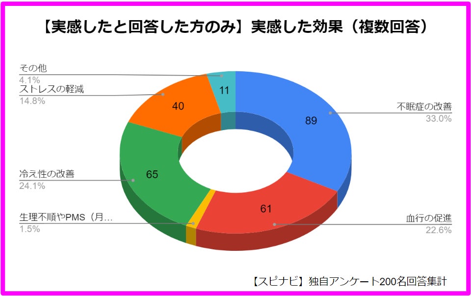 「効果を実感した」と回答した159名に、どのような効果を実感できたのかを質問。不眠症の改善、血行の促進、冷え性の改善を実感できたという回答結果となりました。