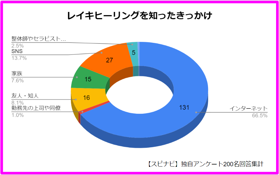 レイキヒーリングを知ったきっかけを質問したところ、インターネットにて知ったという方が200名中131名と、全体の半数以上がインターネットをきっかけにレイキヒーリングの存在を知ったという結果でした。