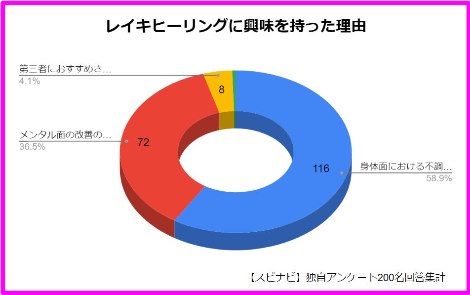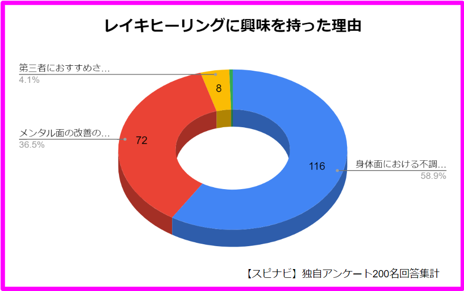 スピリチュアル系ジャンルの中に、当メディアが力を入れている「レイキヒーリング」があるので、アンケートを実施し、レイキヒーリングの効果を客観的な統計データとして取得。