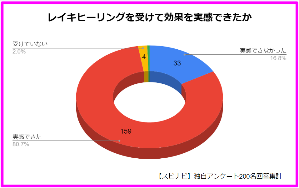 レイキヒーリングは目に見えないものなので、「怪しい」や「効果がない」などのネガティブな印象もありますが、効果を実感した方が8割以上いるという回答結果となりました。