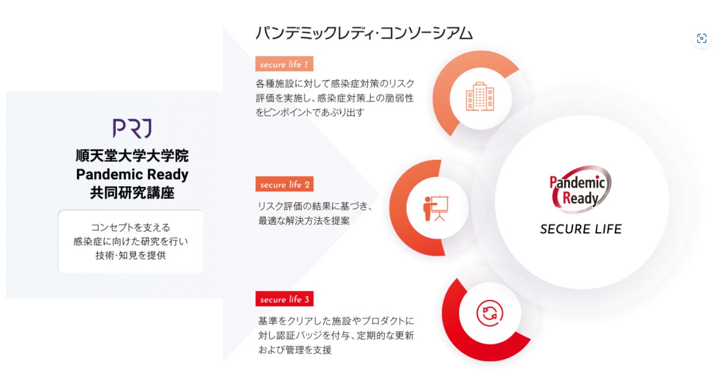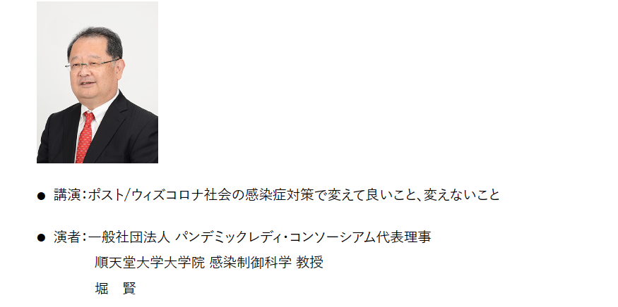 また、ポストコロナ社会では、新型コロナ感染症だけではなく、毎年の季節性インフルエンザやノロウィルスによる感染性胃腸炎など様々な感染症に対して、普段から備える(パンデミックレディ)ことが必要と考えられます。そのためには持続可能な感染症対策が求められ、感染経路と施設・設備・運用面の3要素から感染症対策の現状を客観的に分析し、効率的な感染症対策につなげる方法論に言及します。演者は感染症対策の専門家で順天堂大学大学院感染症科学講座教授であり、当コンソーシアム代表理事の堀賢が務めます。(申し込みは下記URLにて)