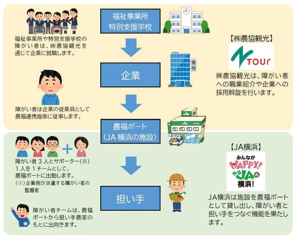 ※障がい者の就職斡旋や企業を介した農作業委託などは、農協法や定款上の制限によりJA横浜で行うことはできないため、農福ポートの運用および直売所業務は㈱農協観光に業務委託して行います。