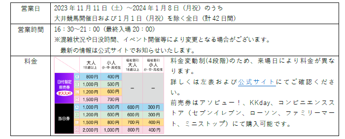 日頃から大井競馬場での取り組み(競馬および東京メガイルミの開催等)にご理解・ご協力いただいている近隣住民、企業、団体の皆様へ感謝の気持ちを込めて下記の通り実施いたします。