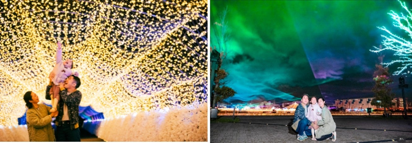 噴水ショーやオーロラ演出、長さ100mの光のトンネルをはじめとした様々なイルミネーションの他、