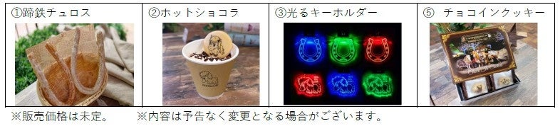 お馬さんにちなんだ「蹄鉄チュロス」や「光るキーホルダー」、かわいいイラストがプリントされた「ホットショコラ」は楽しい気分をさらに盛り上げます。「クッキー」は思い出の共有にも最適です。