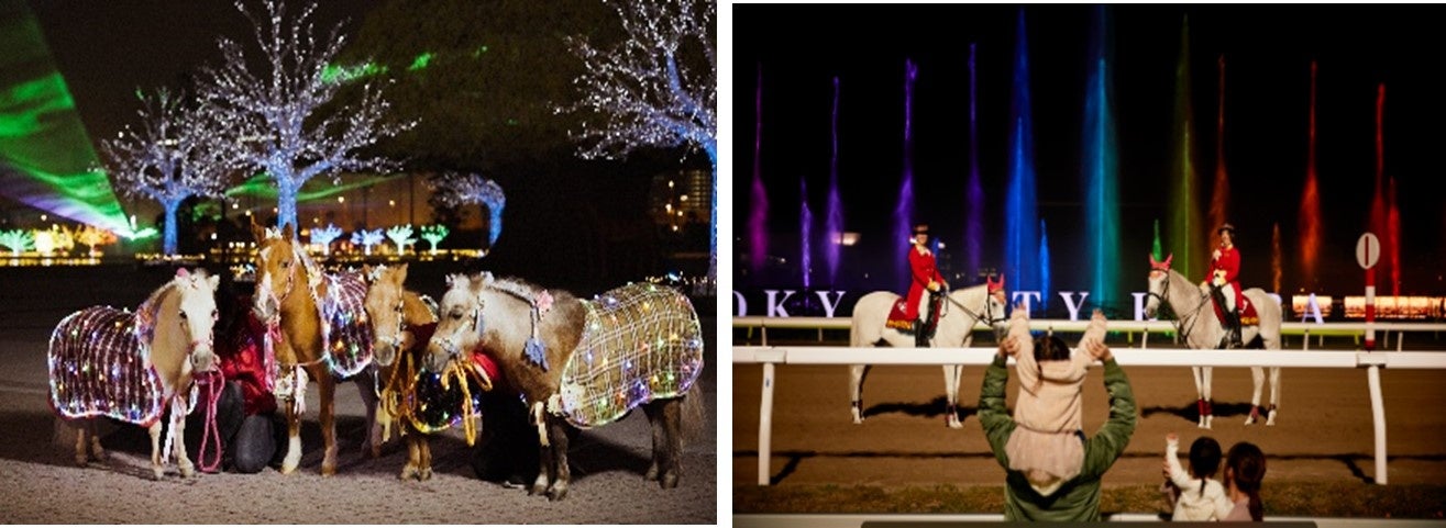 東京メガイルミ(大井競馬場)ならではの企画として大好評の “ミニチュアホース&ポニーとのふれあい” や 、 “噴水×誘導馬のショー” などのお馬さんイベントも充実。