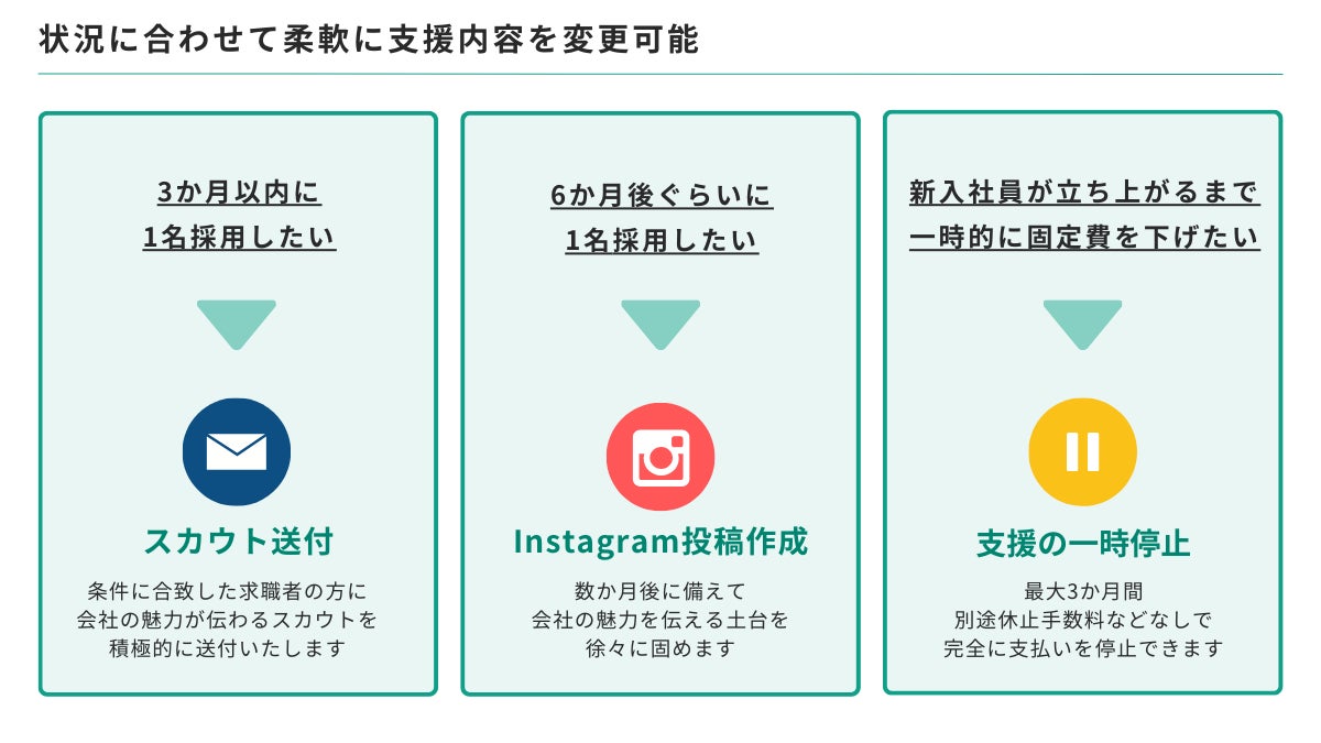 また、採用活動を一時停止させたい時に無料で支援を停止できるオプションや、スカウト送付が不要になった際にInstagram運用に切り替えられるオプションをご用意し、各社の採用状況に合わせた柔軟なご支援を提供できるサービス内容となっております。