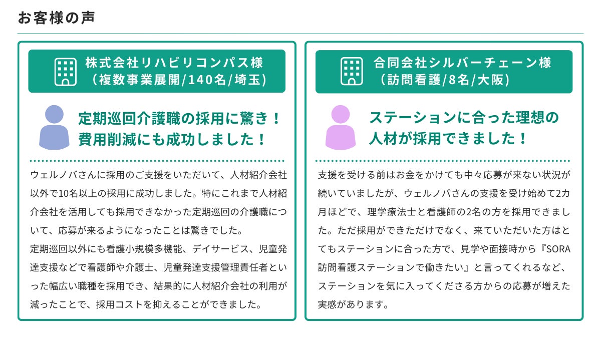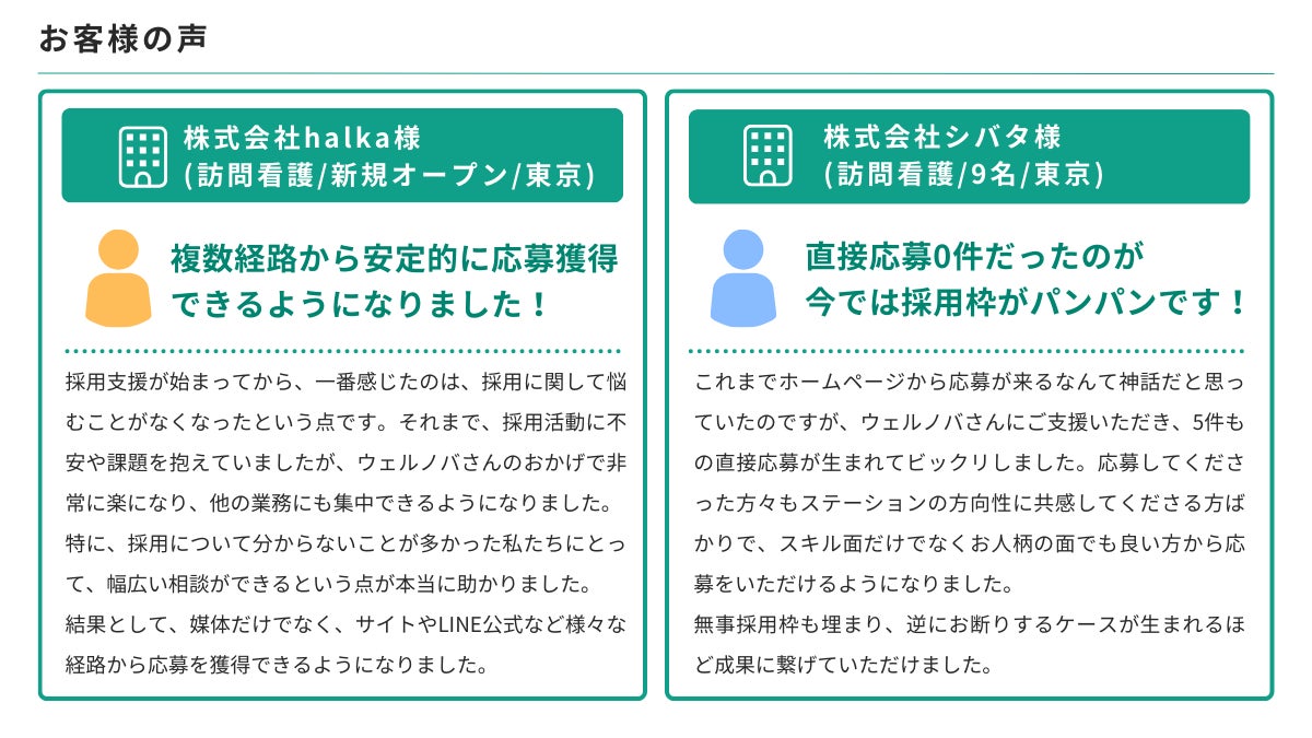 合同会社ウェルノバは「ホスピタリティ溢れる社会の実現に貢献する」というミッションを掲げ、全国の医療・介護事業所に採用支援を提供しており、病院やクリニック、訪問看護、薬局、訪問介護、グループホームなど幅広い施設形態で看護師、介護士、ケアマネジャー、薬剤師、医師など様々な職種からの応募獲得の成功をご支援しております。これからも医療・介護業界の採用課題の解決に貢献できるサービスを展開してまいります。