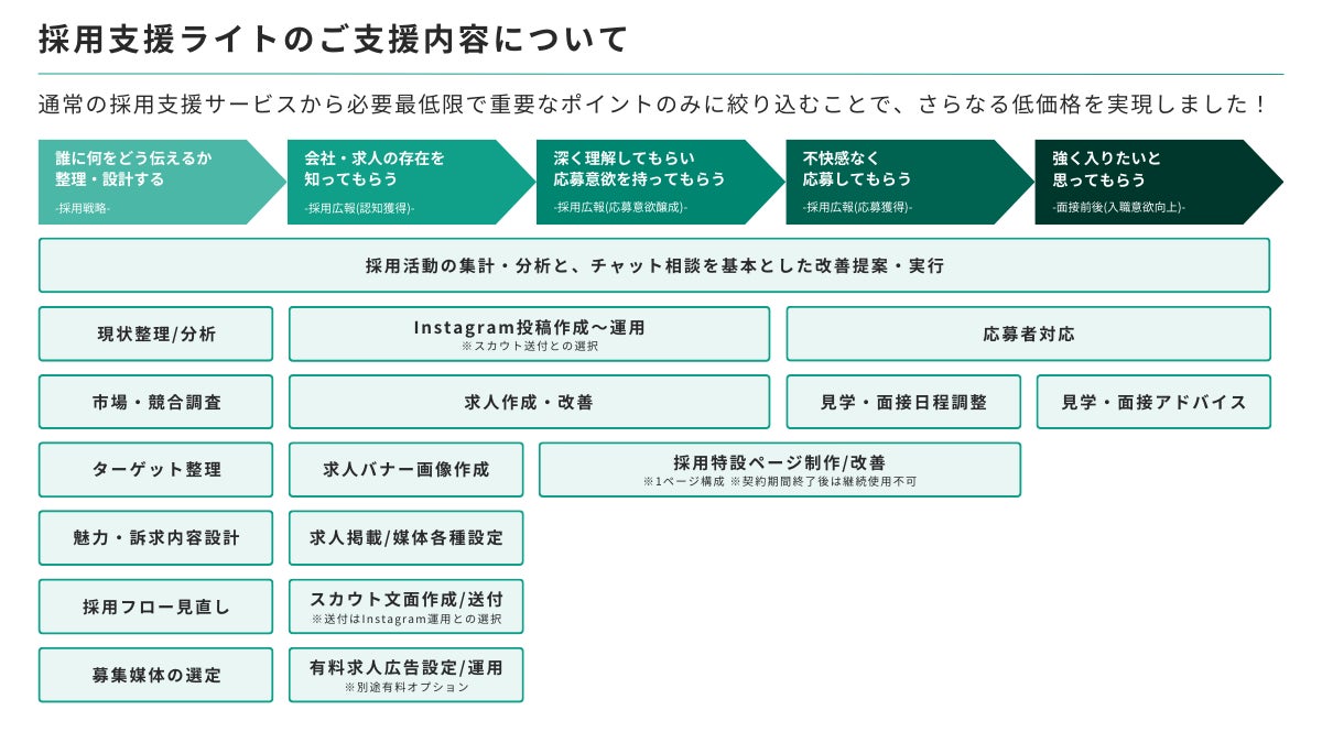 求職者様からの応募が来る仕組み作りを実現できるよう、採用活動において重要な戦略、実行の部分を抑えた、一般的な採用支援サービスと比べても遜色ない支援をご提供いたします。