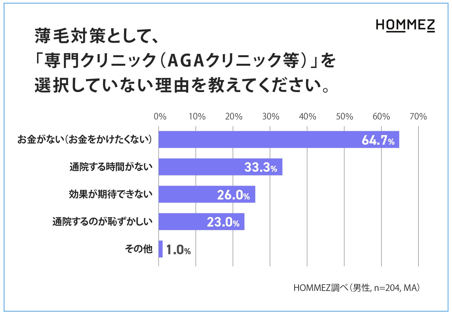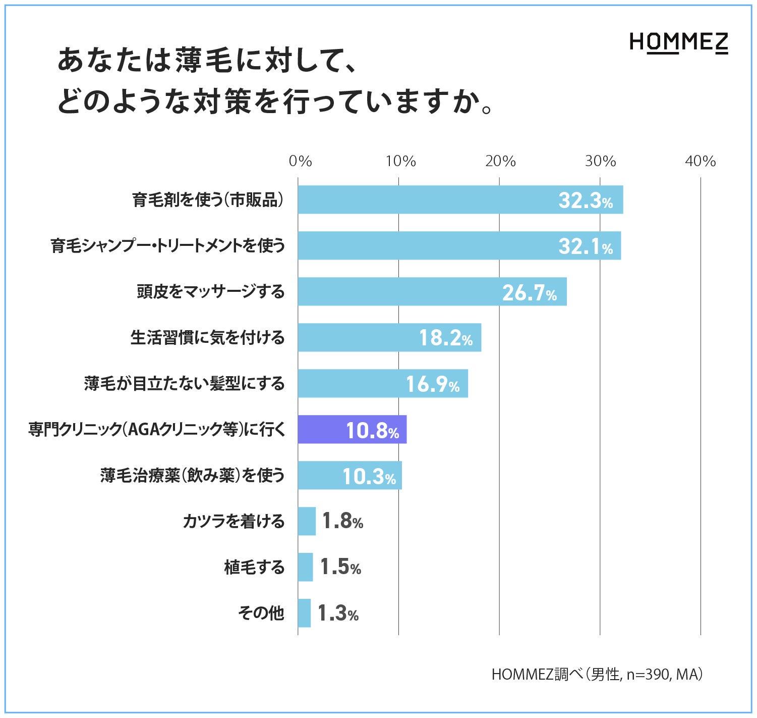 今回の調査によって、AGA等の専門クリニックの利用率は10.8%にとどまり、これを利用しない理由として、費用と時間の負担を大きいと感じていることが分かりました。株式会社HOMMEZは、少しでも多くの悩める男性が課題解決できるよう、治療に関する知識の普及に努めてまいります。