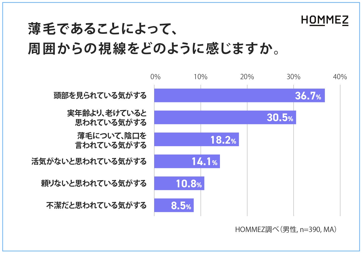 自分自身が薄毛だと認識している20代から50代の社会人男性に対して、周囲からの視線をどのように感じるかを聞いたところ、全体の65.6%が何かしらネガティブな視線を感じると回答しました。内訳をみると、「頭部を見られている気がする」がトップで36.7%、次いで「実年齢より、老けていると思われている気がする」が30.5%でした。