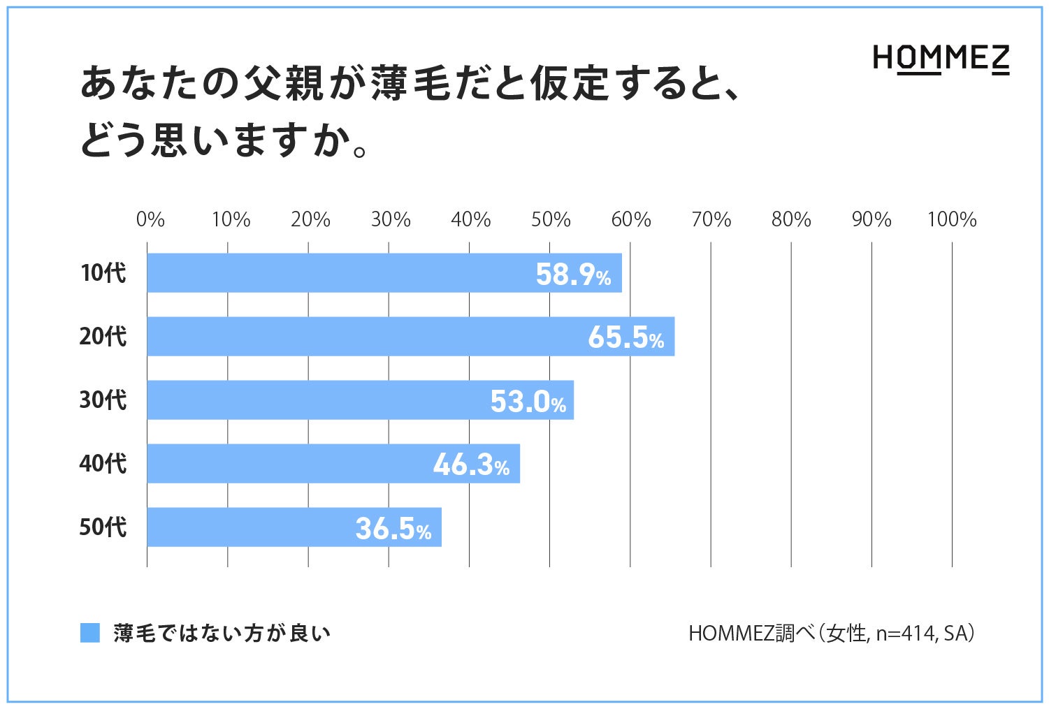 同様に父親がいる女性を対象として、父親が薄毛だったらどうかを聞いたところ、20代で65.5%、50代でも36.5%が「薄毛ではない方が良い」と回答しました。お父さんは娘にとっては永遠の憧れなのでしょうか。いつまでも若々しくいて欲しいと願っている様子がうかがえました。