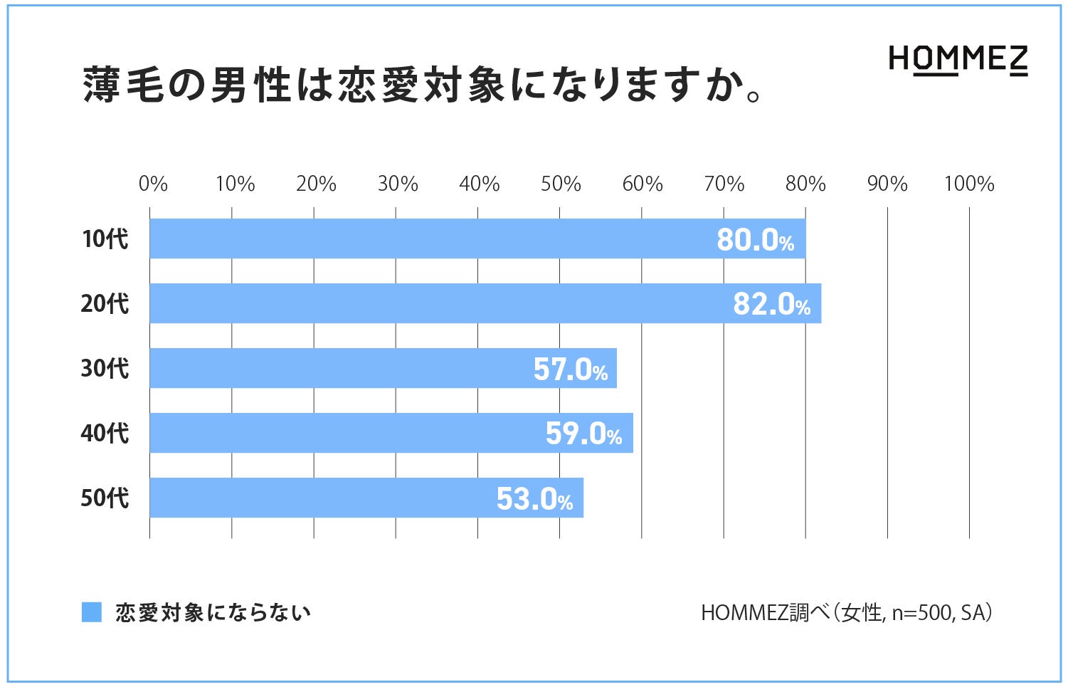 10代から50代の女性に、薄毛の男性が恋愛対象になるかどうかを聞いたところ、20代で82.0%、10代で80.0%が「恋愛対象にならない」と回答。なんと、恋活の中心となる世代の8割に忌避されているようです。薄毛男性にとっては、なんとも手厳しい、辛辣な結果となりました。