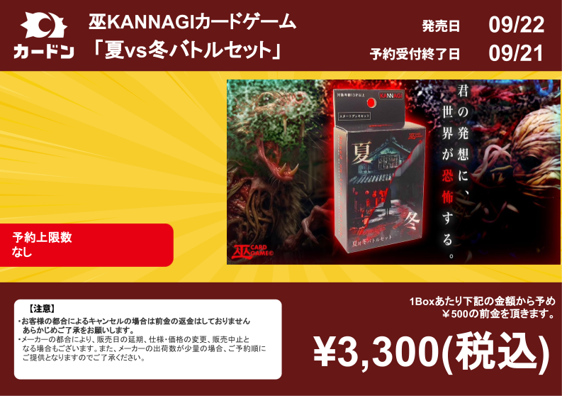 国内300ヶ所以上の心霊スポットを撮影した経験をもとに心霊Youtuber「おもいでのレモネード屋さん」が全く新しいトレーディングカードゲーム「巫カードゲーム 夏VS冬バトルセット」を、株式会社カードンのトモハッピー会長が運営する秋葉原カードン本店に9月22日(金)に先行発売した。すでに多くのユーザーから高い支持を得ている。
