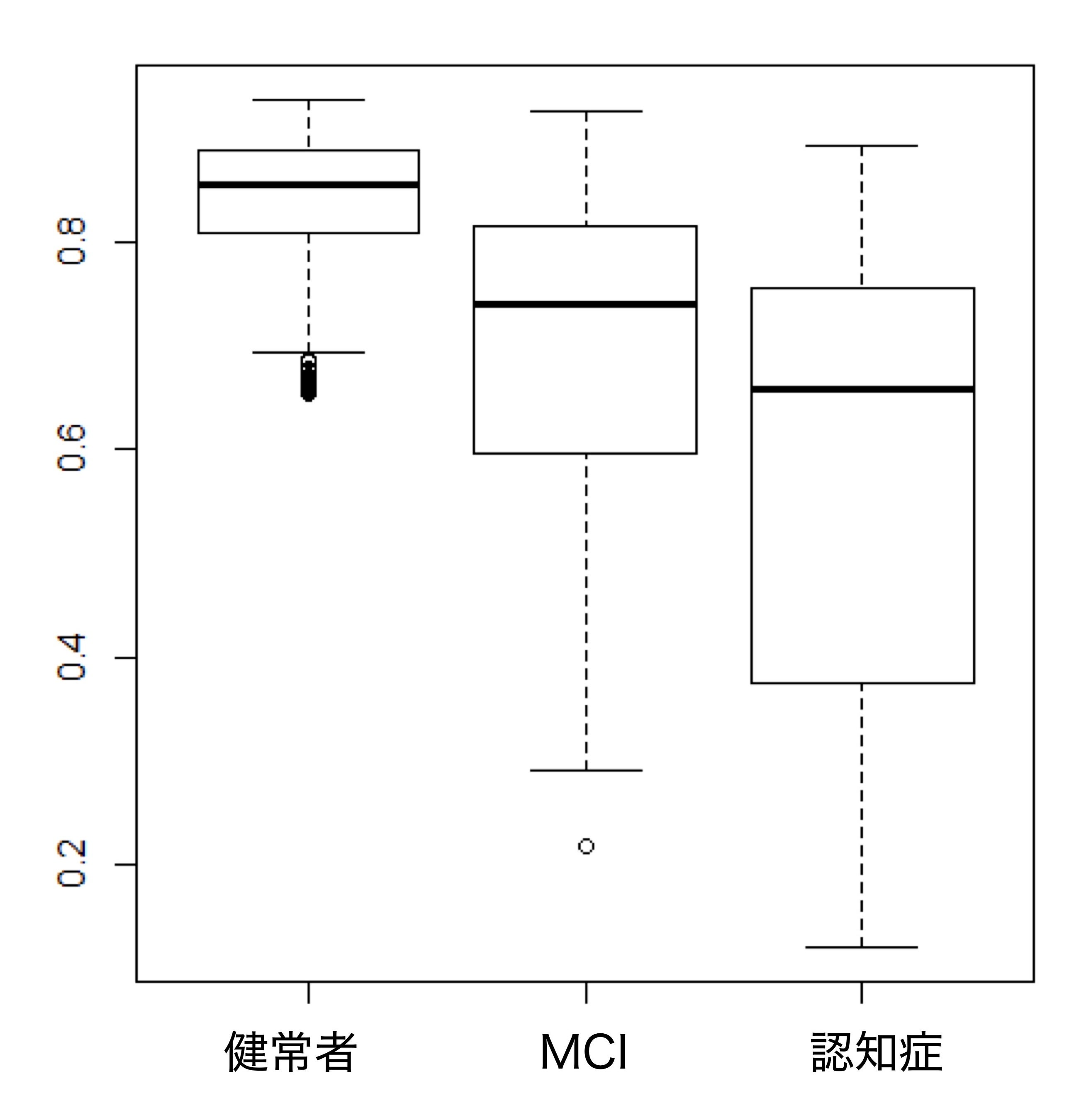 Welchのt検定(*p<0.05): p = 0.000378(健常者群とMCI群)、p=8.365×10e-13(健常者群と認知症群)(論文投稿準備中)