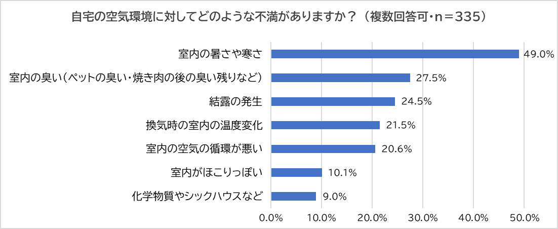 続いて、「自宅の空気環境に不満はあるか?」尋ね、「ある」(52.3%)と回答した人に、「どのような不満か?」尋ねたところ、半数弱が「室内の暑さや寒さ」(49.0%)と回答し最多。以下、「室内の臭い(ペットの臭い・焼き肉などの臭い残りなど)」(27.5%)、「結露の発生」(24.5%)、「換気時の室内の温度変化」(21.5%)、「室内の空気の循環が悪い」(20.6%)となりました。