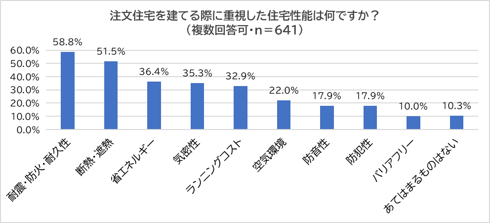自身または配偶者が建てた注文住宅に1年以上5年未満住んでいる人に「注文住宅を建てる際に重視した住宅性能は何か?」尋ねたところ、半数以上が「耐震・防火・耐久性」(58.8%)、「耐熱・遮熱」(51.5%)、3割以上が「省エネルギー」(36.4%)、「気密性」(35.3%)、「ランニングコスト」(32.9%)と回答。「空気環境」(22.0%)は4~5人に1人程度でした。