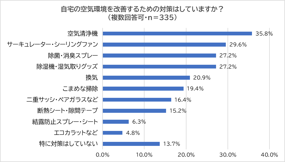 では、「空気環境を改善するためにどのような対策をしているか?」尋ねました。最も多かった対策法は「空気清浄機」(35.8%)で、「サーキュレーター・シーリングファン」(29.6%)、「除菌・消臭スプレー」「除湿機・湿気取りグッズ」(共に27.2%)、「換気」(20.9%)と続き、多くの人が何かしら対策をしていることがわかりました。