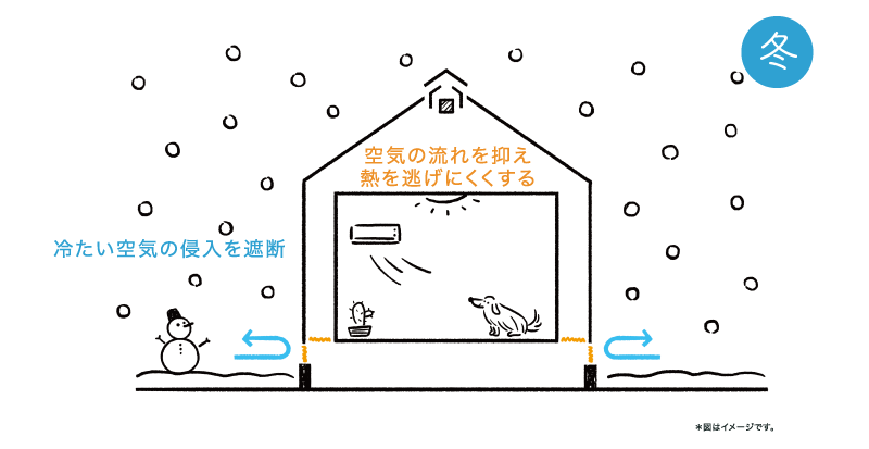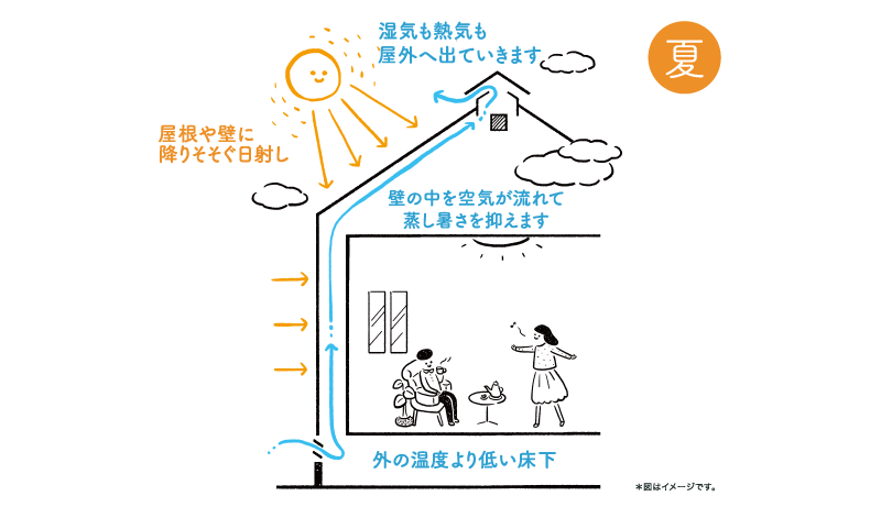 WB工法は、夏は壁の中の空気を流すことで室内を快適に保ち、冬は外気を遮断して気密性と断熱性を上げることで室内の熱を逃がしにくくします。そのため、夏も冬も快適な環境を家の中につくることができるのです。