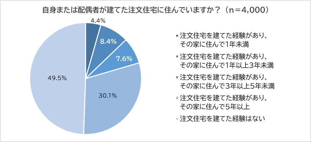 一戸建て(持ち家)に住んでいる人に「自身または配偶者が建てた注文住宅に住んでいるか?」尋ねたところ、半数(50.5%)が建てた注文住宅に居住し、30.1%が「5年以上」、8.4%が「1円以上3年未満」、7.6%が「3年以上5年未満」、4.4%が「1年未満」経っていることがわかりました。