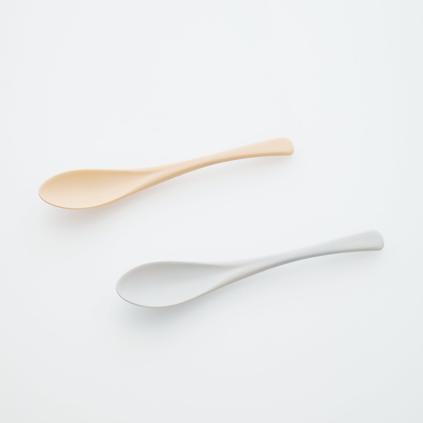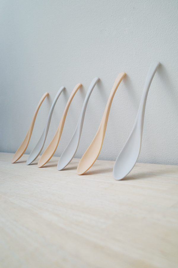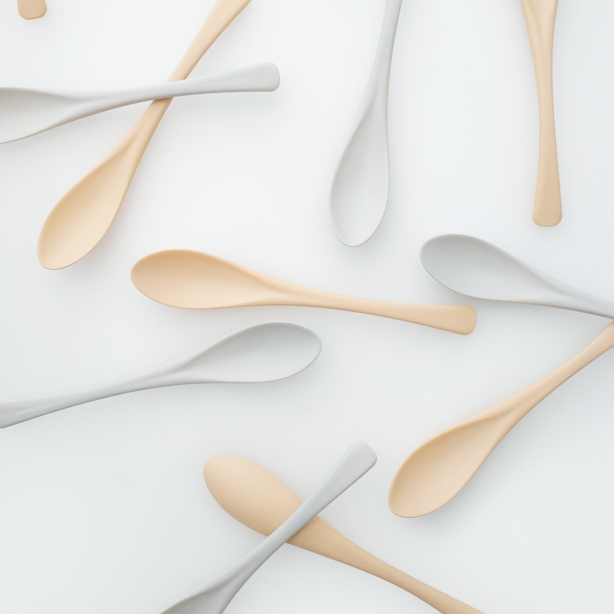 出来上がったのは、わずか15gの2色のスプーン。色は、洋食シーンでもすんなり馴染むステンレスグレー。そして、どんな食器の色にも優しく調和する、メープルのような明るさをしたウッドベージュ。質感は、口当たりの良いツヤ消しの仕上げ。