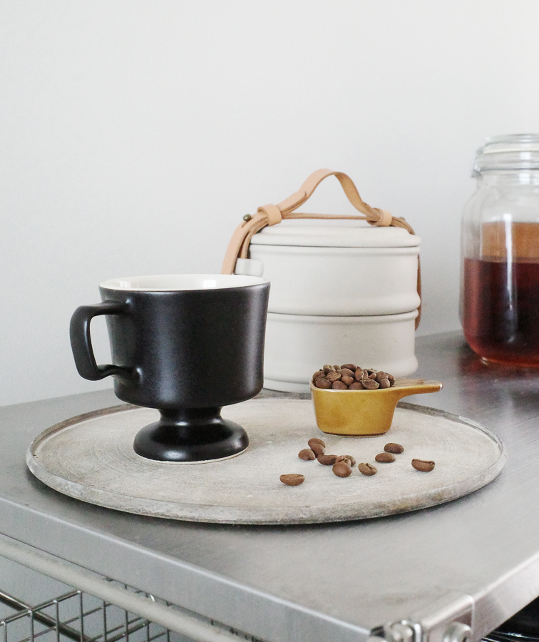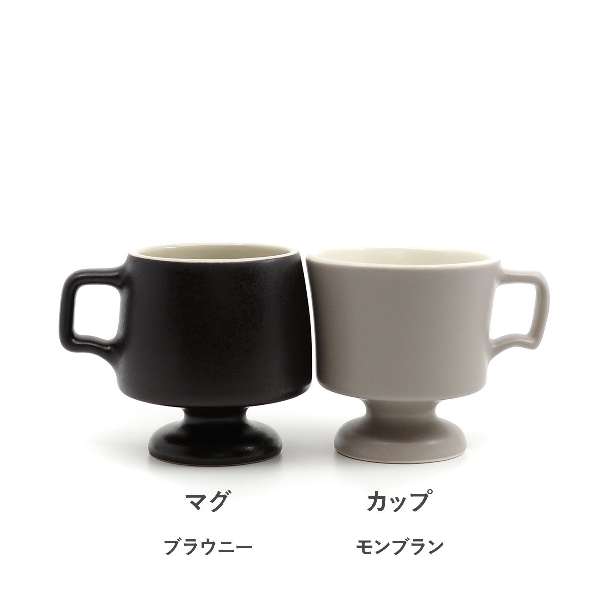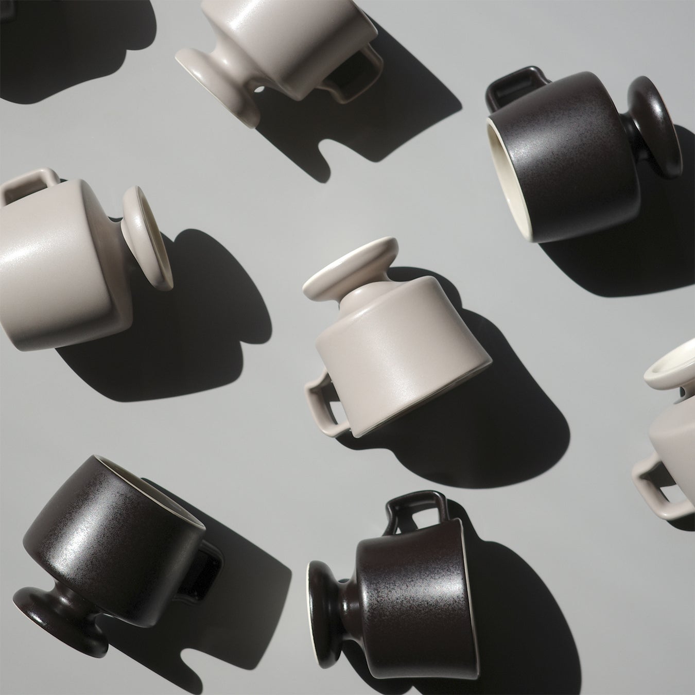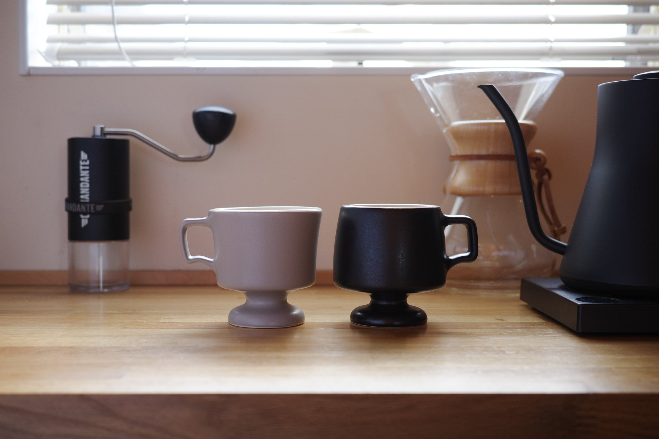 ゴブレットは、愛知県瀬戸市で全て手作業で作られています。形は2種。口がすぼまったマグと、広がったカップ。カップには、飲み終えると僅かに残ったコーヒーで、豆の形を描く遊びを心を加えました。