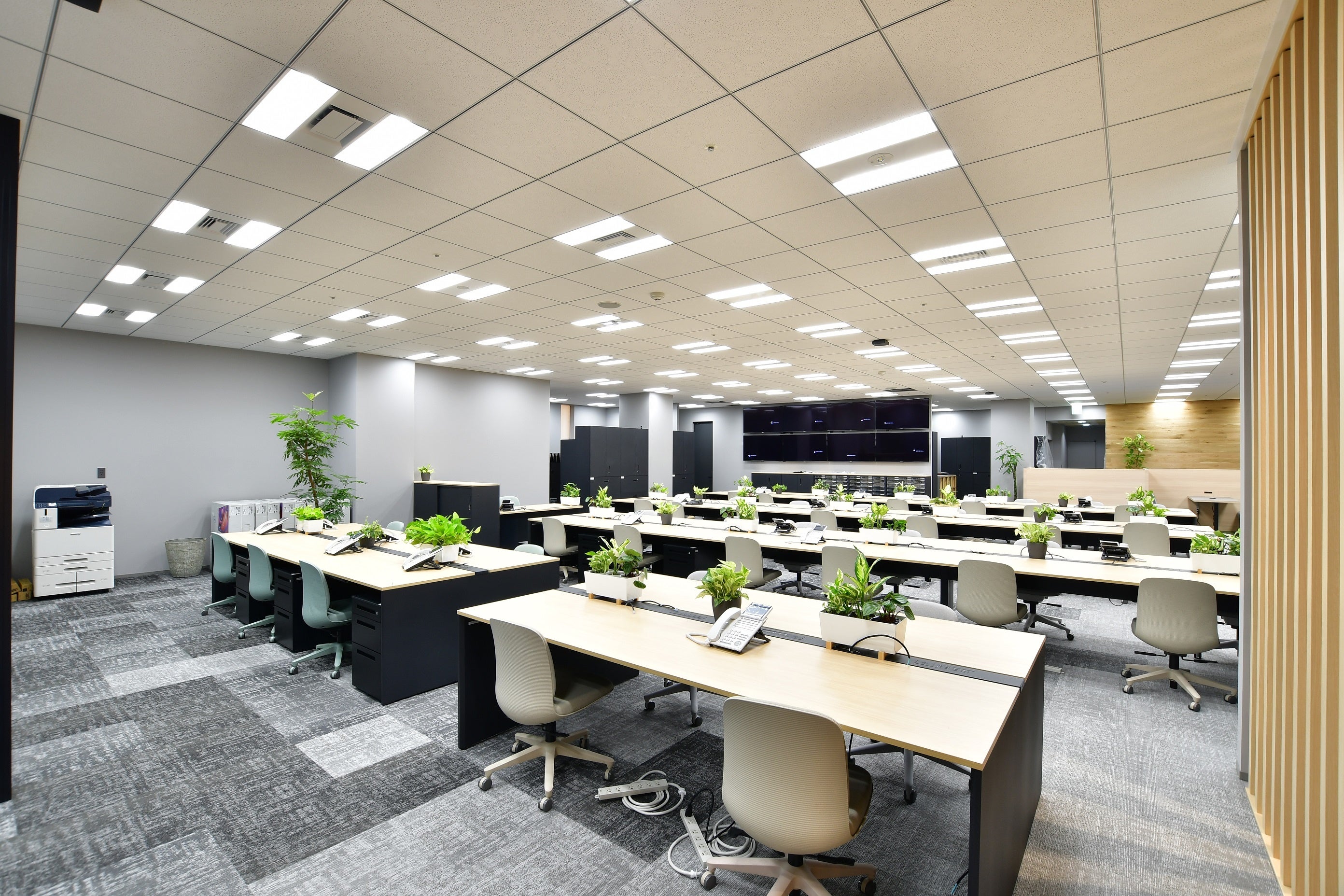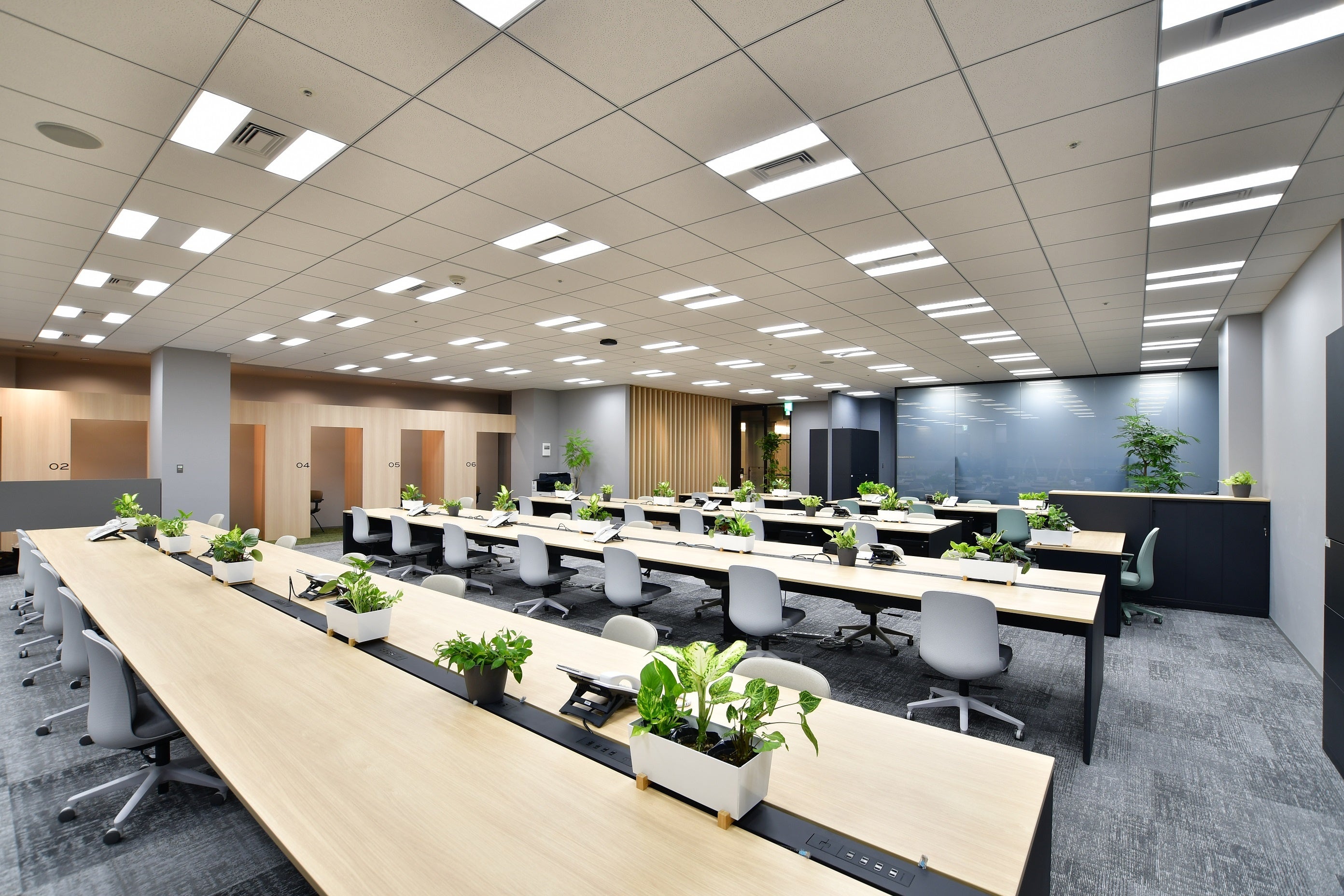 ・ワンフロアに全員が揃うことで、風通しのよい意見が社員同士で飛び交い、フリーアドレスによって、今まで生まれることのなかった課をまたぐ助言や会話がうまれています。