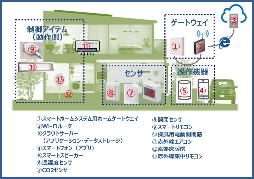 ・スマートデバイスによる各種データを収集し、室内の温度環境が設定温度通りになっているか、設計要因、各機器の使い方の検証・分析を実施
