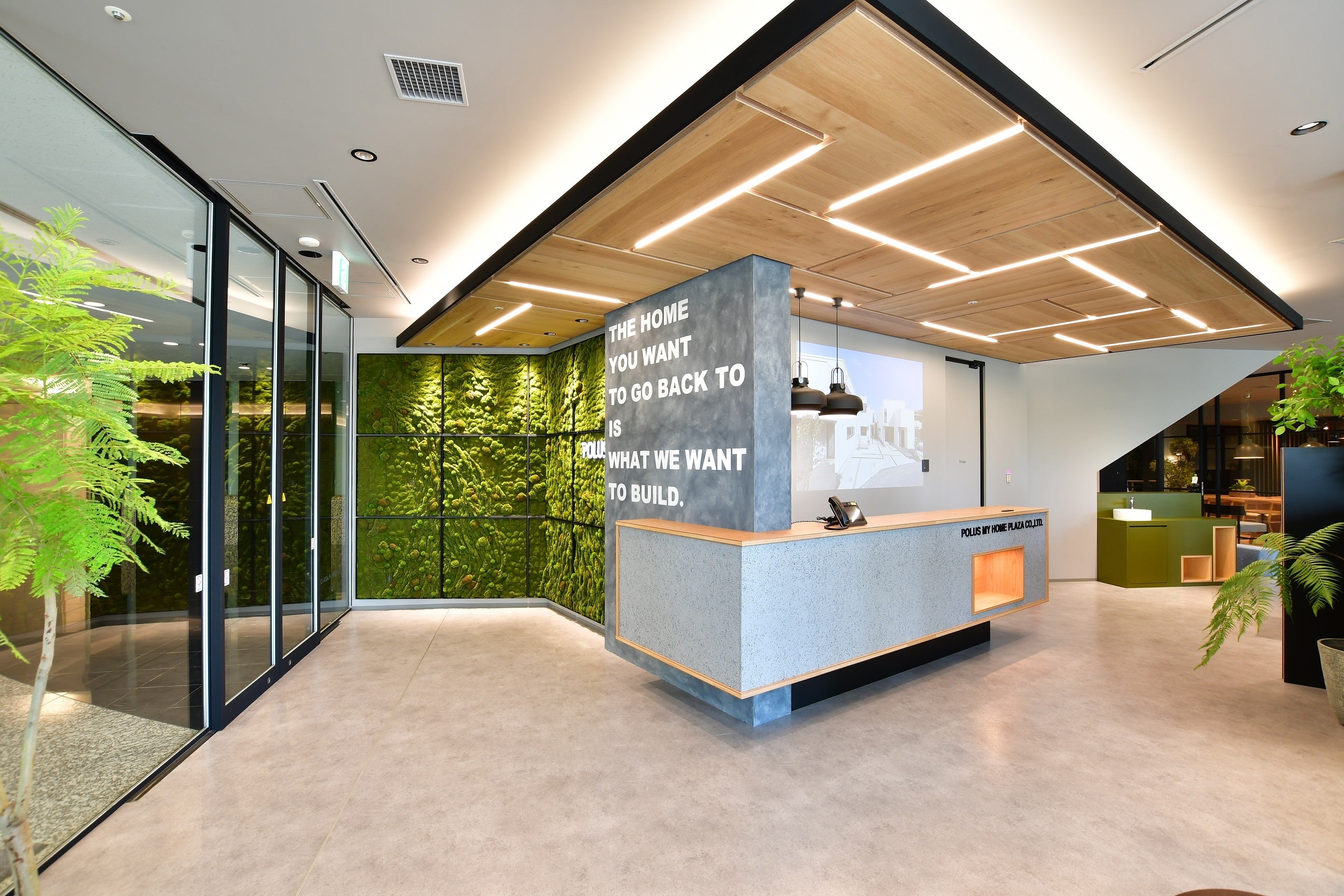 「CAFE」×「OFFICE」・「INORGANIC」×「BOTANICAL」をテーマにお客様と弊社スタッフの距離感を縮められるようなガラス張りでオープンな空間に仕上げました。森と海をイメージしたキッズコーナーや、授乳室、安心感のある接客ブースなどお客様にくつろいでいただきながら、気軽にお住まい探しのご相談をいただける空間設計となっております。