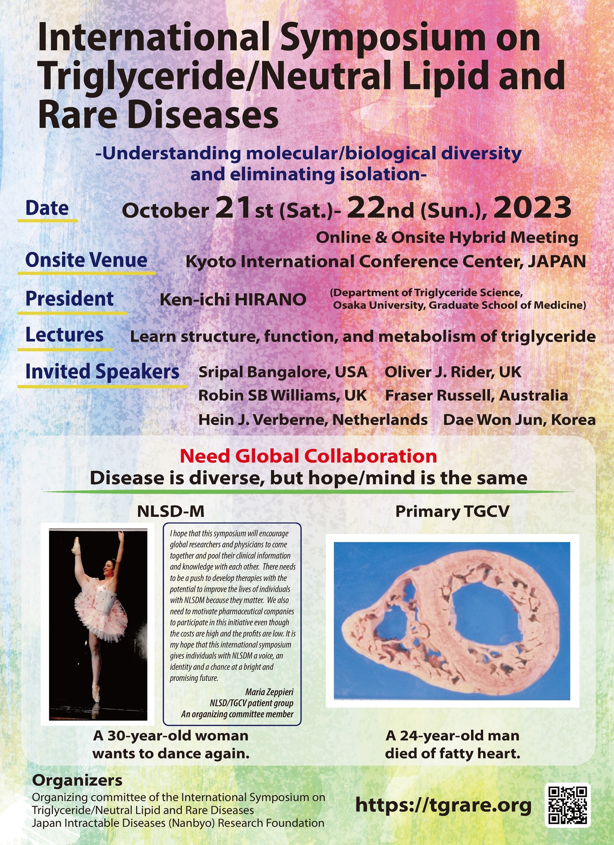 国際シンポジウム「中性脂肪と希少難病」実行委員会(実行委員長 大阪大学大学院医学系研究科 平野賢一)は、この度、国際シンポジウム「中性脂肪と希少難病」ー多様性の理解と孤立の解消のためにー を国立京都国際会館にて開催することとなりました。