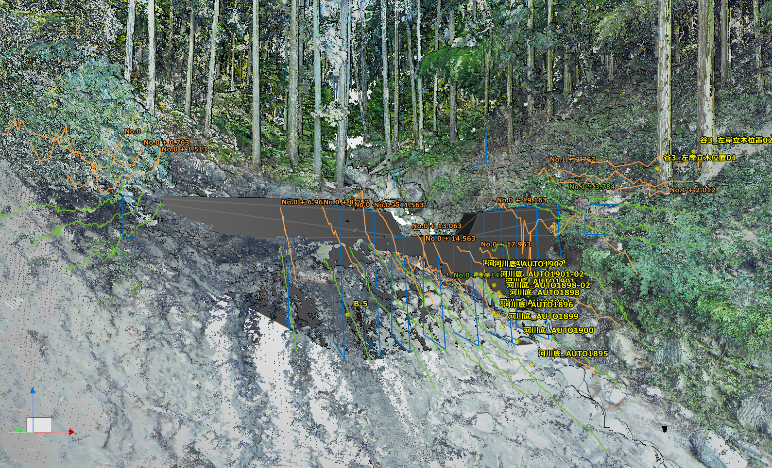 地上型3Dレーザースキャナーを使用することで、10分弱で直径数百m圏内の現況地盤を高速スキャニングし、最小1.6mm単位の正確な点群データを取得することができます。設計の大前提となる測量を、迅速かつ正確に行うことができ、プロジェクト全体の精度が高まります。あらゆる形状の地形に対して有効なので、急峻な山間部で危険を伴う起工測量作業が不要になります。