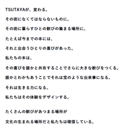 TSUTAYAが「地域に交流を生む新しい時代の体験型書店」へと進化し、TSUTAYAを通じて地域の人と人とがつながり、自分の好きなものを互いに重ねていくことができる、仲間のいる「場」でありたい、という想いを込めて、コーポレートスローガンを「好きが、生きる。」といたしました。