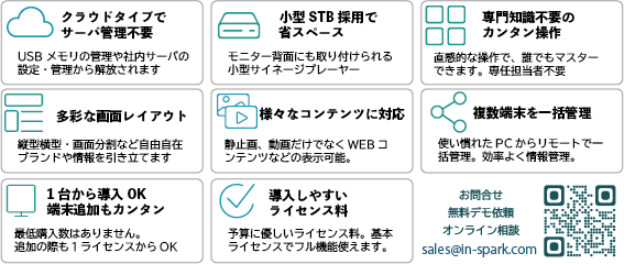 「デジタルサイネージって費用が高いでしょ」「まだまだ敷居が高くて検討を足踏みしています」などの声や、すでに導入している企業では、店舗ごとに多数のデジタルサイネージを導入している故に、かなりの年間ライセンス料を支払われており、その割に「使い勝手が悪い」、あるいは「専任のスタッフでないと作業ができない」などという声があります。