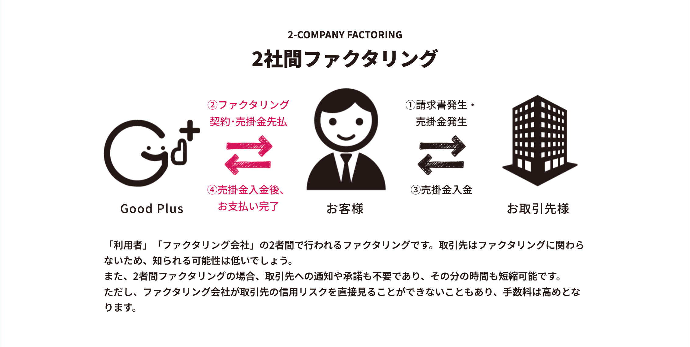 GoodPlus株式会社(https://goodplus-service.co.jp/)は、現在他社様にてファクタリングを活用中のお客様限定で、手数料や調達額のご相談に対応させていただくサービス