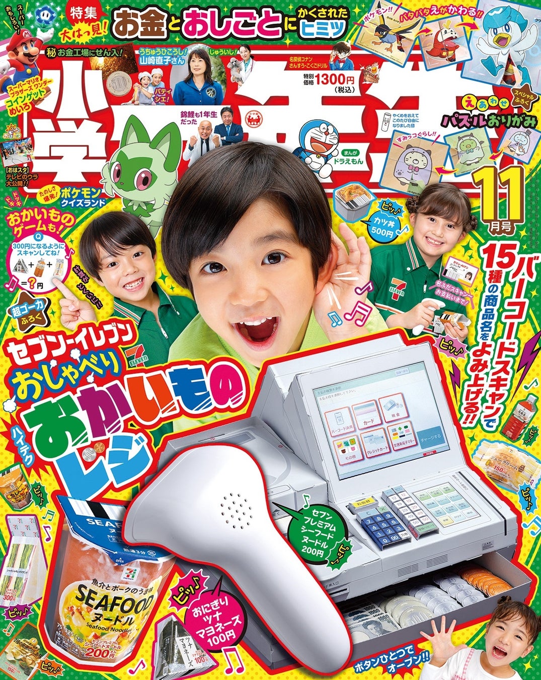 ご自宅で簡単にセブン-イレブンでのレジ対応の仕事が体験をできるセットとして、誌面付録として登場。11種類のおかいものゲームが内蔵され、「500円になるように商品を選んでスキャンして」など楽しみながらお仕事体験を学べる機能も満載です。
