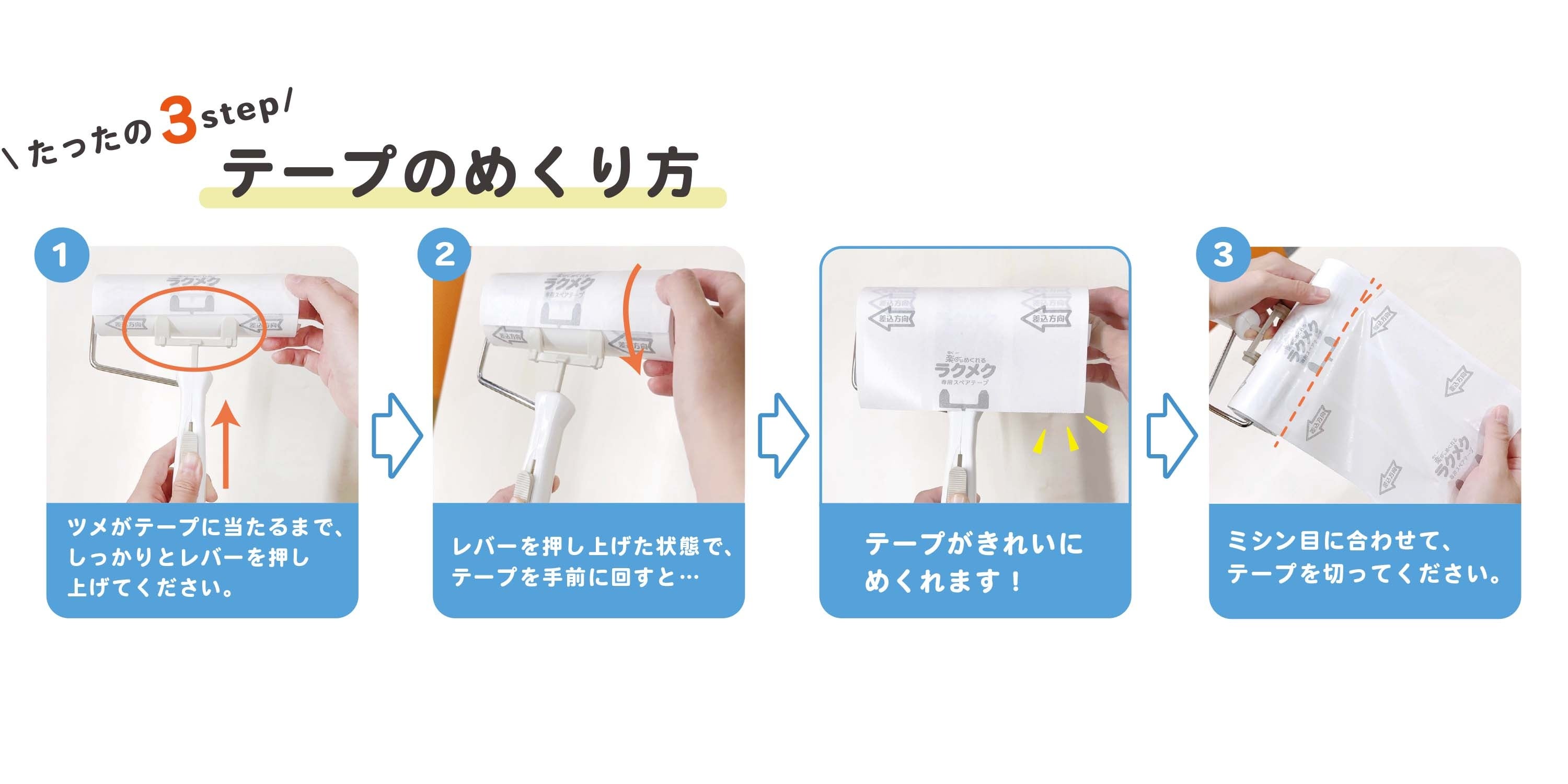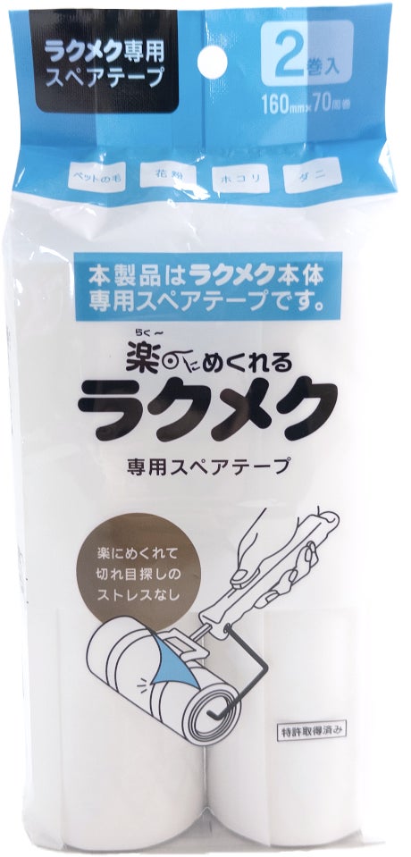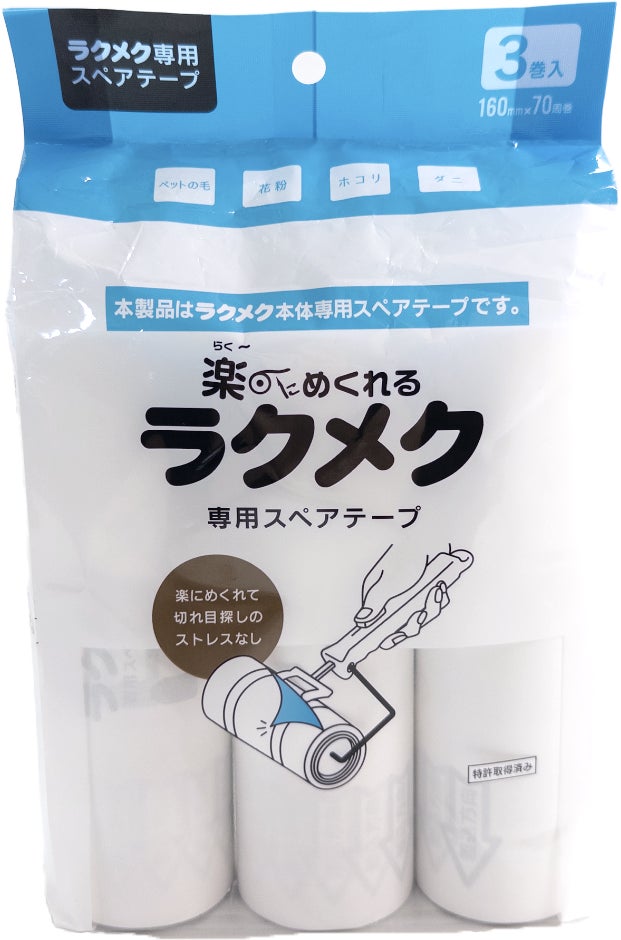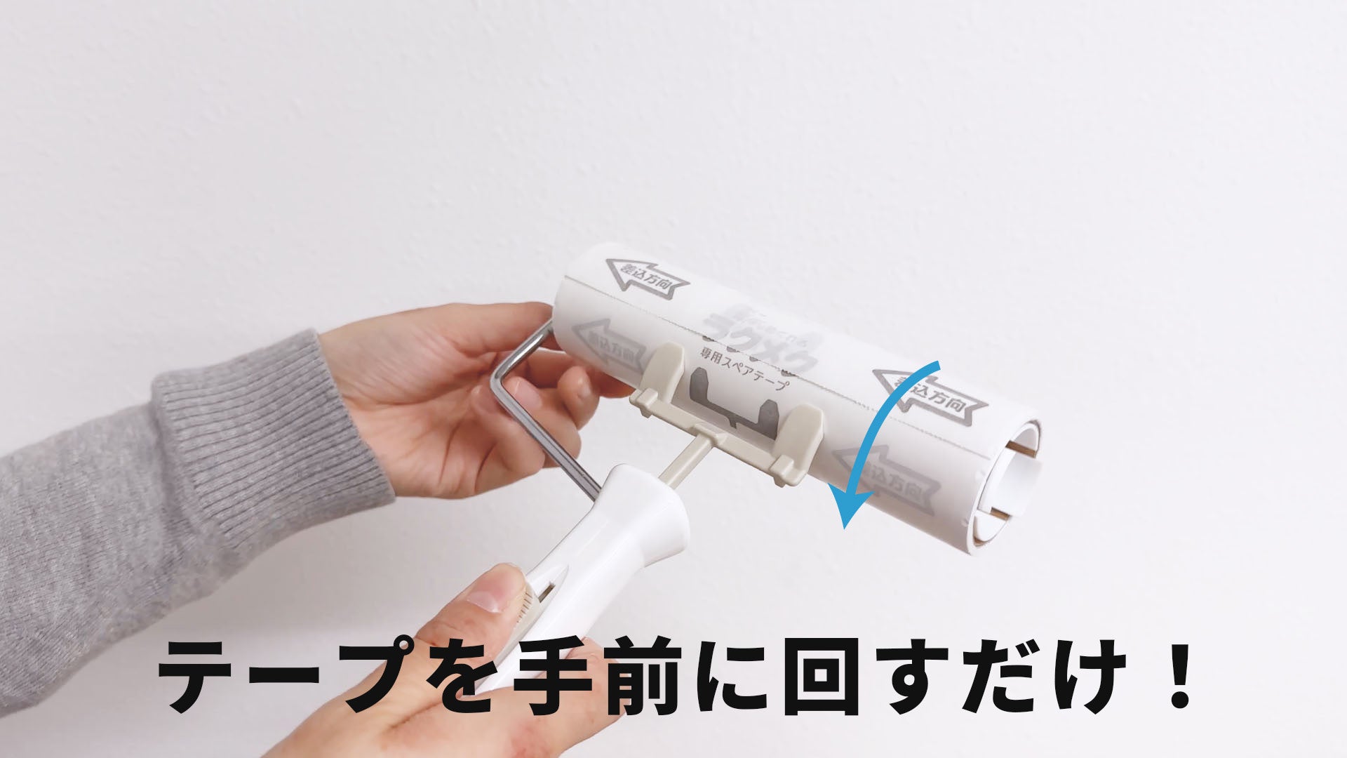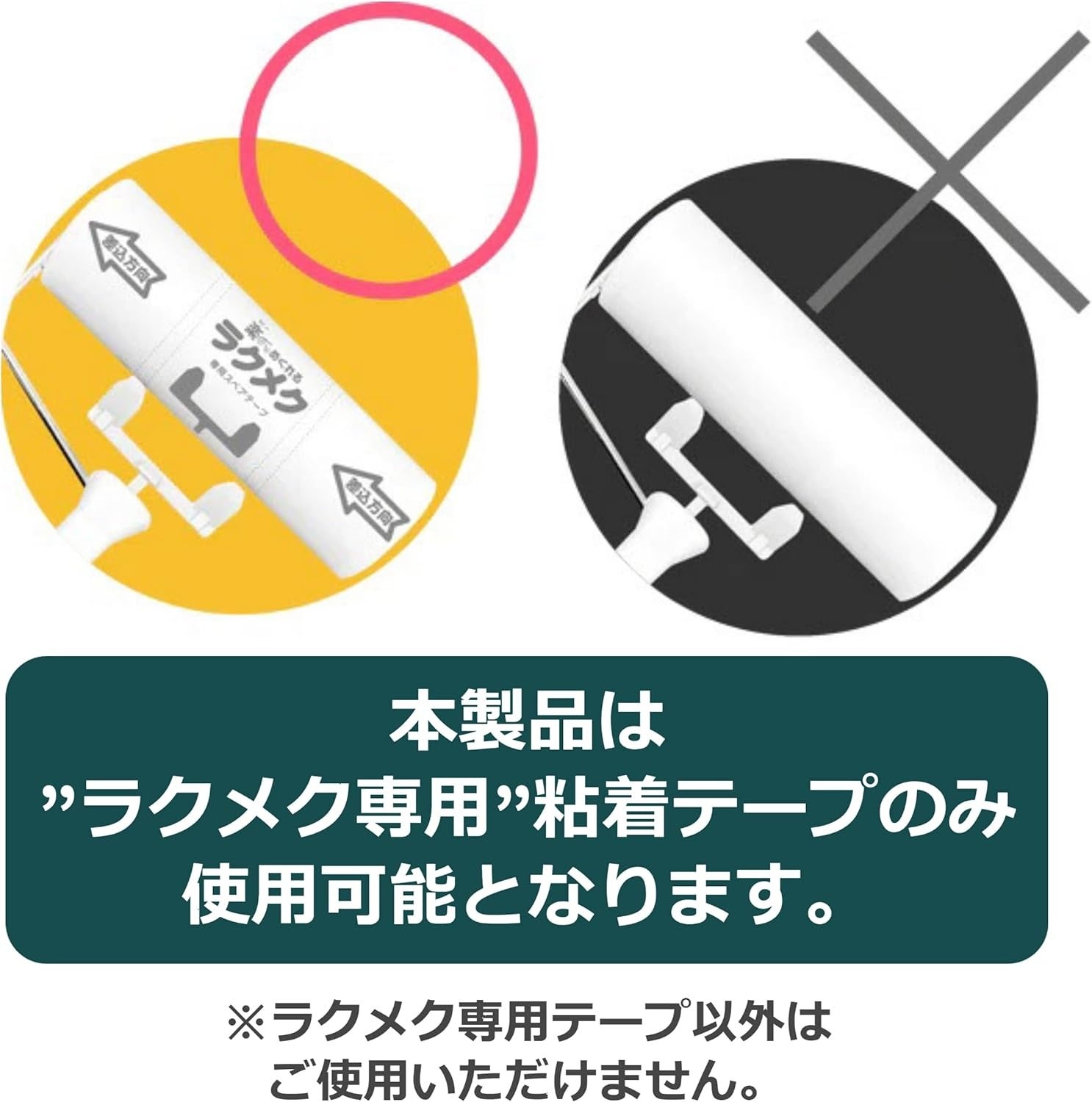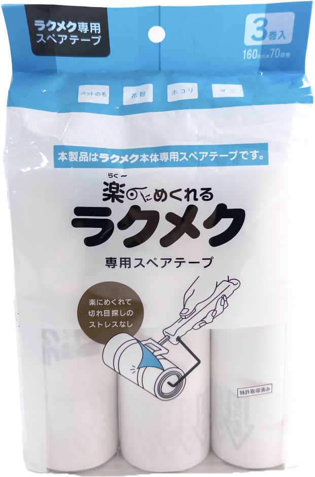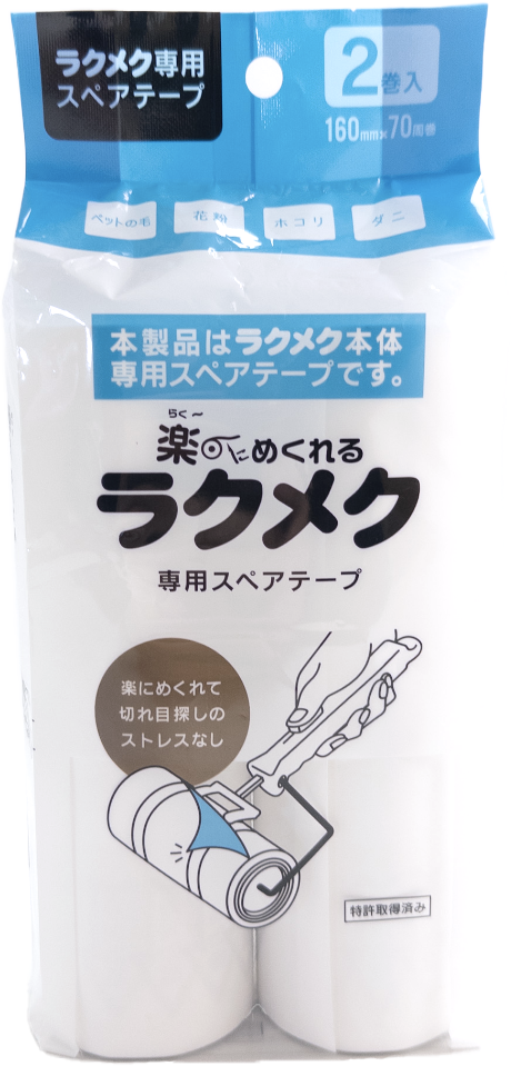 粘着クリーナー本体には、テープをめくりあげてくれるツメがついております。このツメを活かすため、ラクメク専用テープには、ツメの接地面に非粘着加工を施しており、極限までめくりやすくしております。他社製の粘着テープはご使用になれませんのでご注意ください。