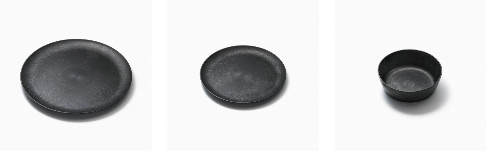 「トランスウッド」は間伐材と廃食用油などを使って製造されたバイオマス樹脂を配合した環境に優しい新素材で軽く割れにくい特徴があります。黒色の美しいグラデーションの3つの器は様々な料理を引き立てます。少ない皿数で上質な食卓をお楽しみください。