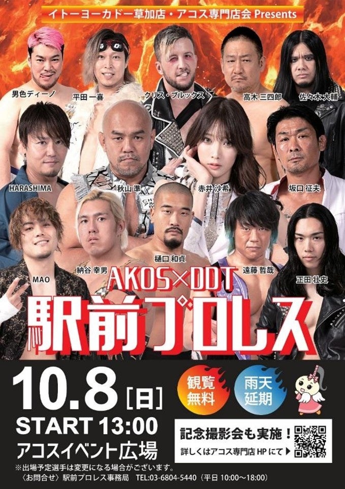 アコス南館(イトーヨーカドー草加店及びアコス専門店街)は、プロレス団体「DDTプロレスリング」を招いて、『AKOS×DDT駅前プロレス』を草加駅東口にあるアコスイベント広場で開催します。