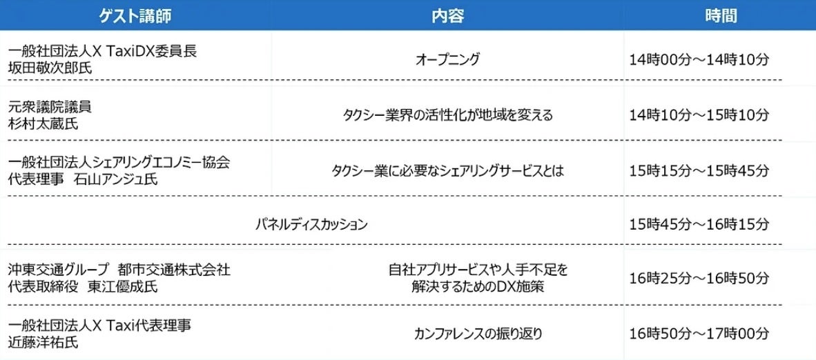 昨今タクシー業界は DX 化の遅れや人手不足により、ライドシェアの参入が大きな話題となるなど業界として大きな転換期を迎えています。そのような中、ゲスト講師として杉村太蔵氏や石山アンジュ氏を招き、タクシーによる地域活性化やシェアリングサービスなど業界外から見たタクシー業界のあるべき姿についてご講演いただき、カンファレンス後半では自社で IT 化に取り組み成果を出しているタクシー事業者様に登壇頂き、タクシーDX 化の先進事例をご講演いただきます。タクシー業界関係者だけでなく一般参加も受け付けておりますのでぜひご参加ください。