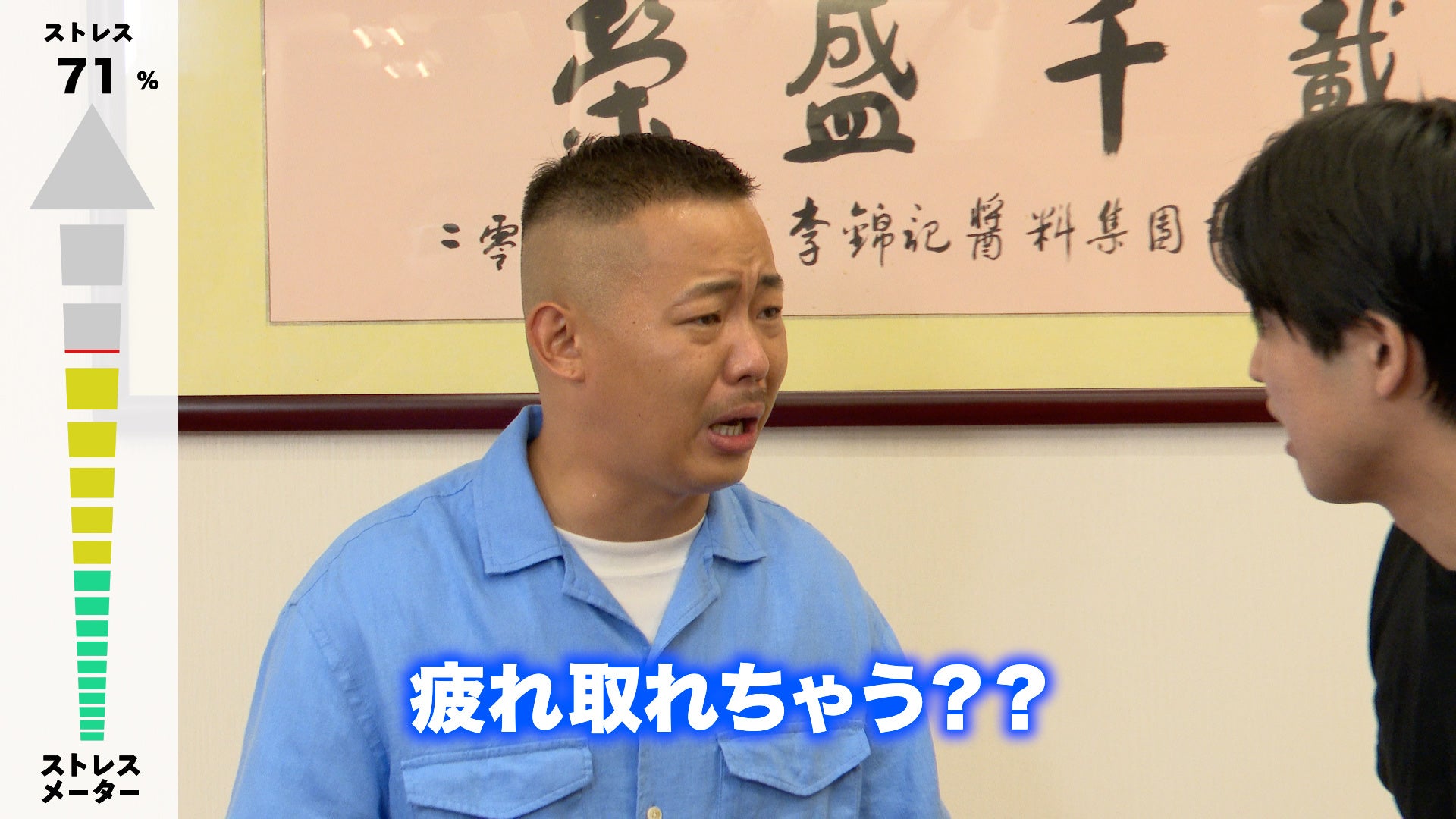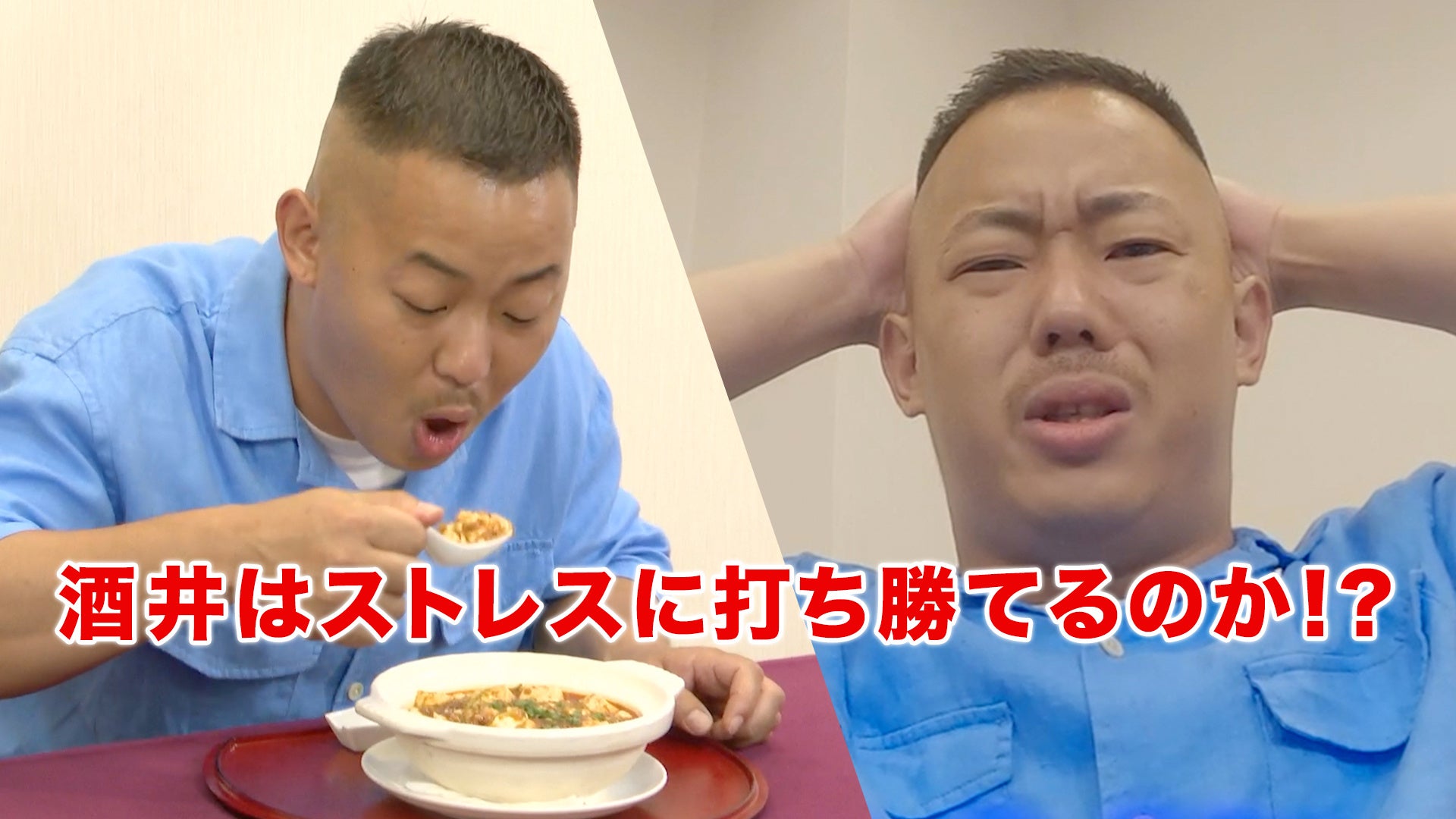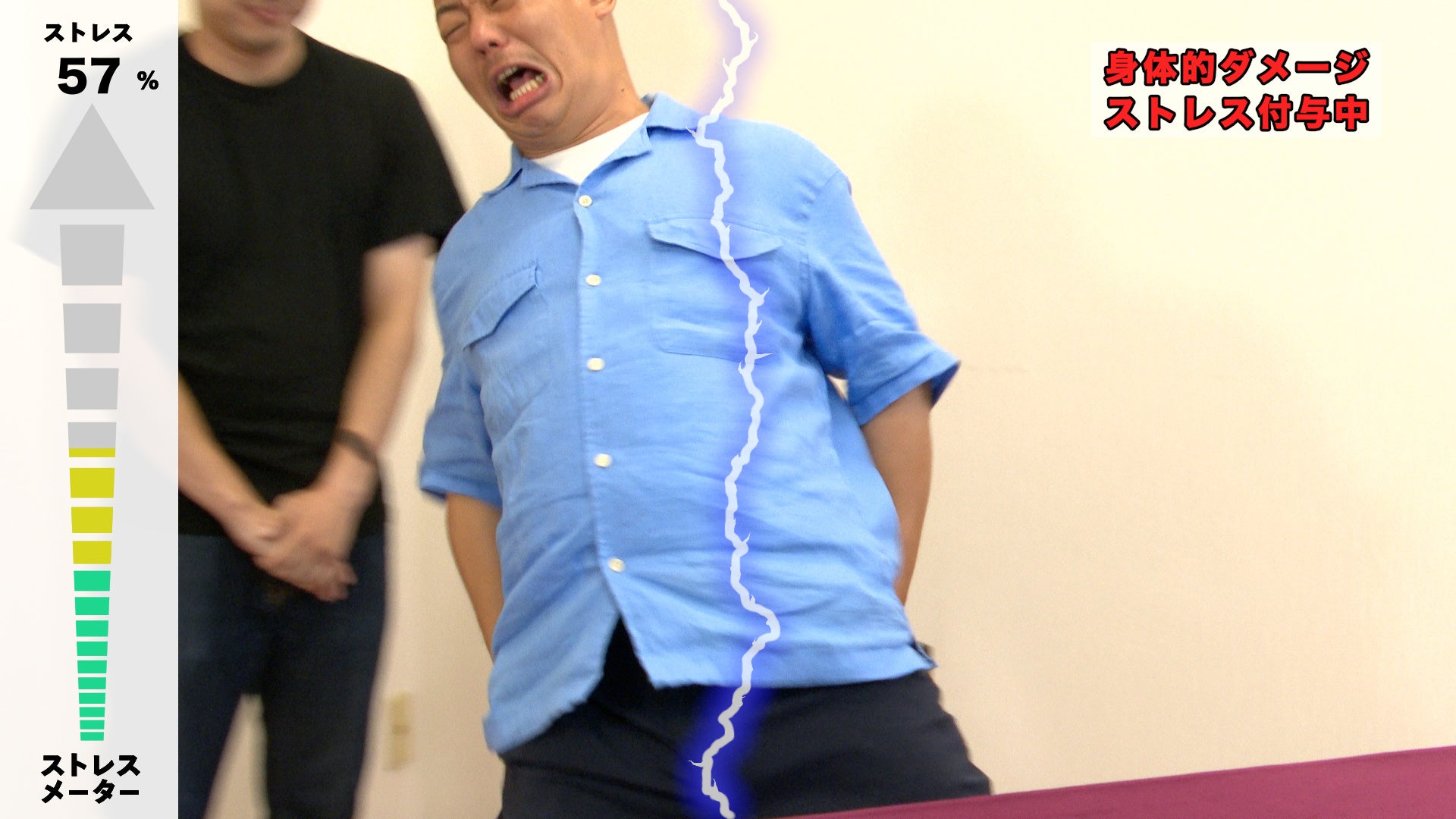 連続のストレスを受けてお疲れの酒井さんに超強力の電流ビリビリ椅子の攻撃。突然の激痛に思わず椅子から崩れ落ちた酒井さんは「焼け焦げてない?」と慌てた表情になってしまいます。電流で受けた“身体的ダメージ”を麻婆豆腐の辛味で解消していきます。