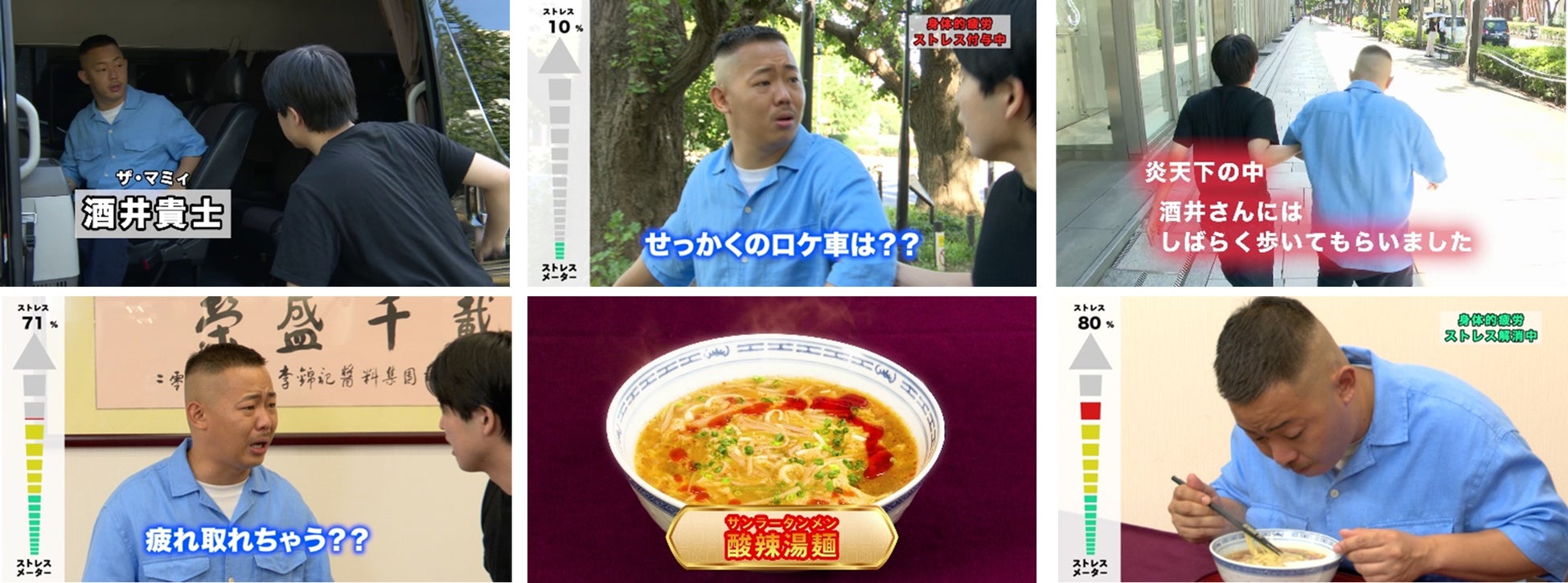 事務所から“NGはありません!”と回答のあった酒井さんを炎天下のなか長時間の徒歩移動で“身体的疲労”をかけます。へとへとに疲れているところで、疲労回復効果が期待できる酸味成分がたっぷり入った“酸辣湯麺”を召し上がっていただくことに。果たして身体的疲労ストレスに効くのか…結果は動画をご覧ください。