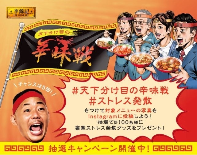 キャンペーン参加店舗に来店後、対象メニューを頼んで写真を撮影し、「#天下分け目の辛味戦」「#ストレス発散」をつけてInstagramに投稿すると、抽選で計100名様にコーヒーメーカーをはじめとした、豪華ストレス発散グッズをプレゼントします。