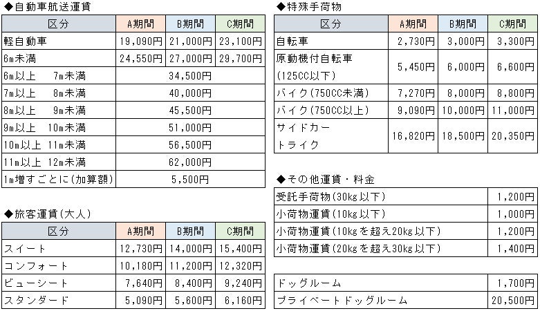 販売価格:[車輌]普通車22,000円 軽自動車17,000円※差額で個室・指定席利用可能(スイート+6,000円/コンフォート+4,000円/ビューシート+2,000円)