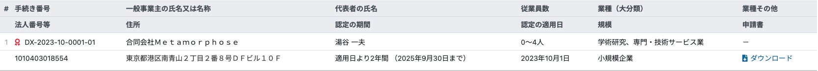 合同会社Metamorphoseは、2023年10月1日付で、情報処理の促進に関する法律第三一条に基づく認定制度「DX認定制度」の認定事業者として認定を受けました。