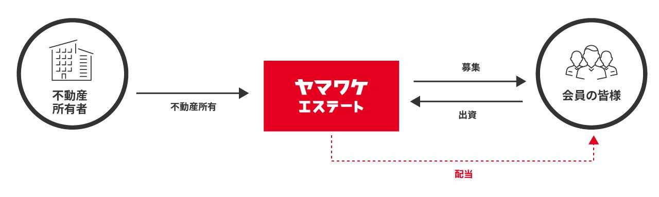 不動産特定共同事業法(第1号・第2号)に則り、「ヤマワケエステート」がビルなどの不動産物件を購入後、運用して(賃借や売却等)得られた利益の一部を、投資家に配当として還元いたします。そのため、通常は高額な出資が必要となる不動産投資とは違い、投資家は1万円(*1)から投資をすることができます。