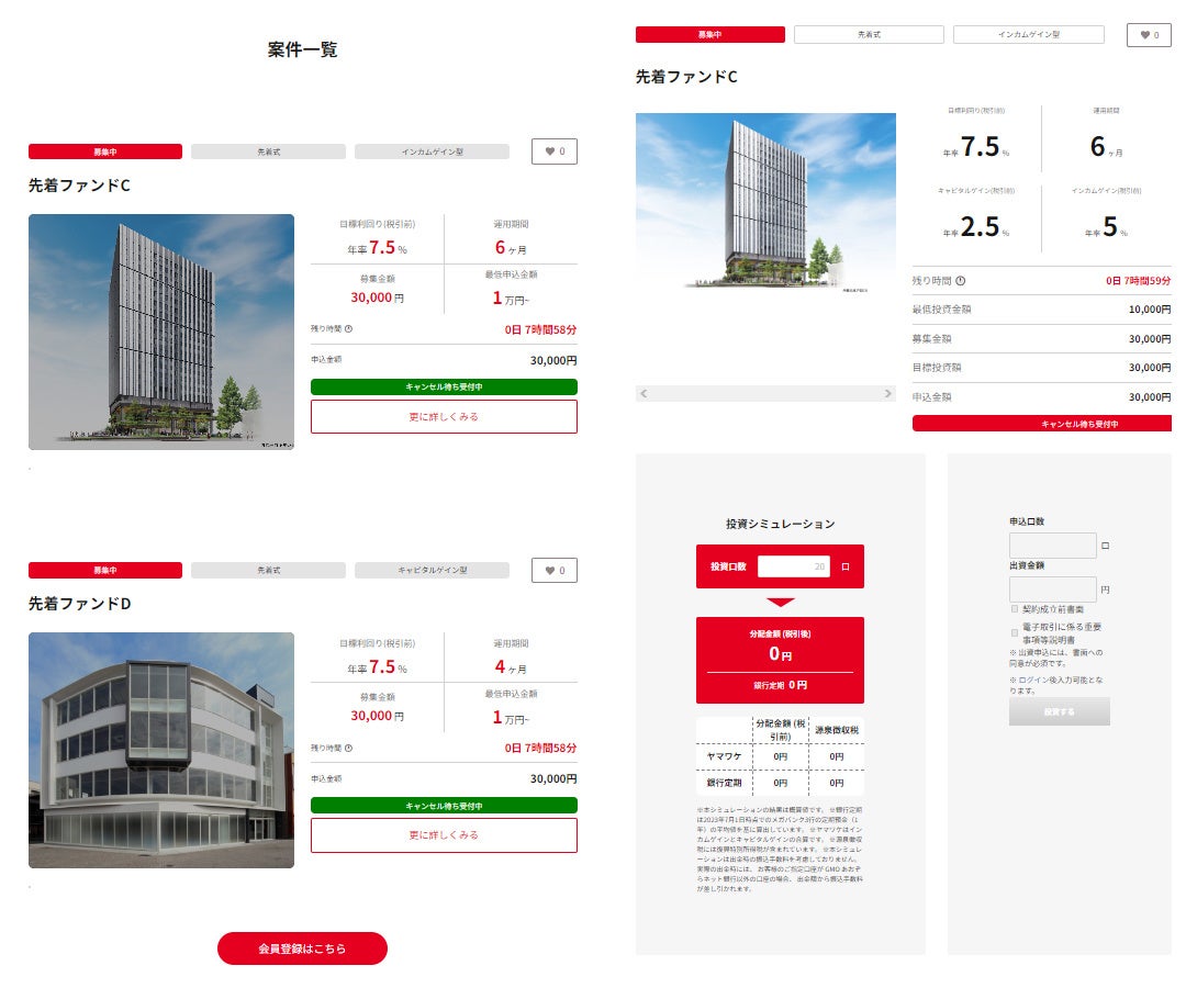 不動産案件イメージ: (左)案件一覧ページ (右)ファンド詳細ページ