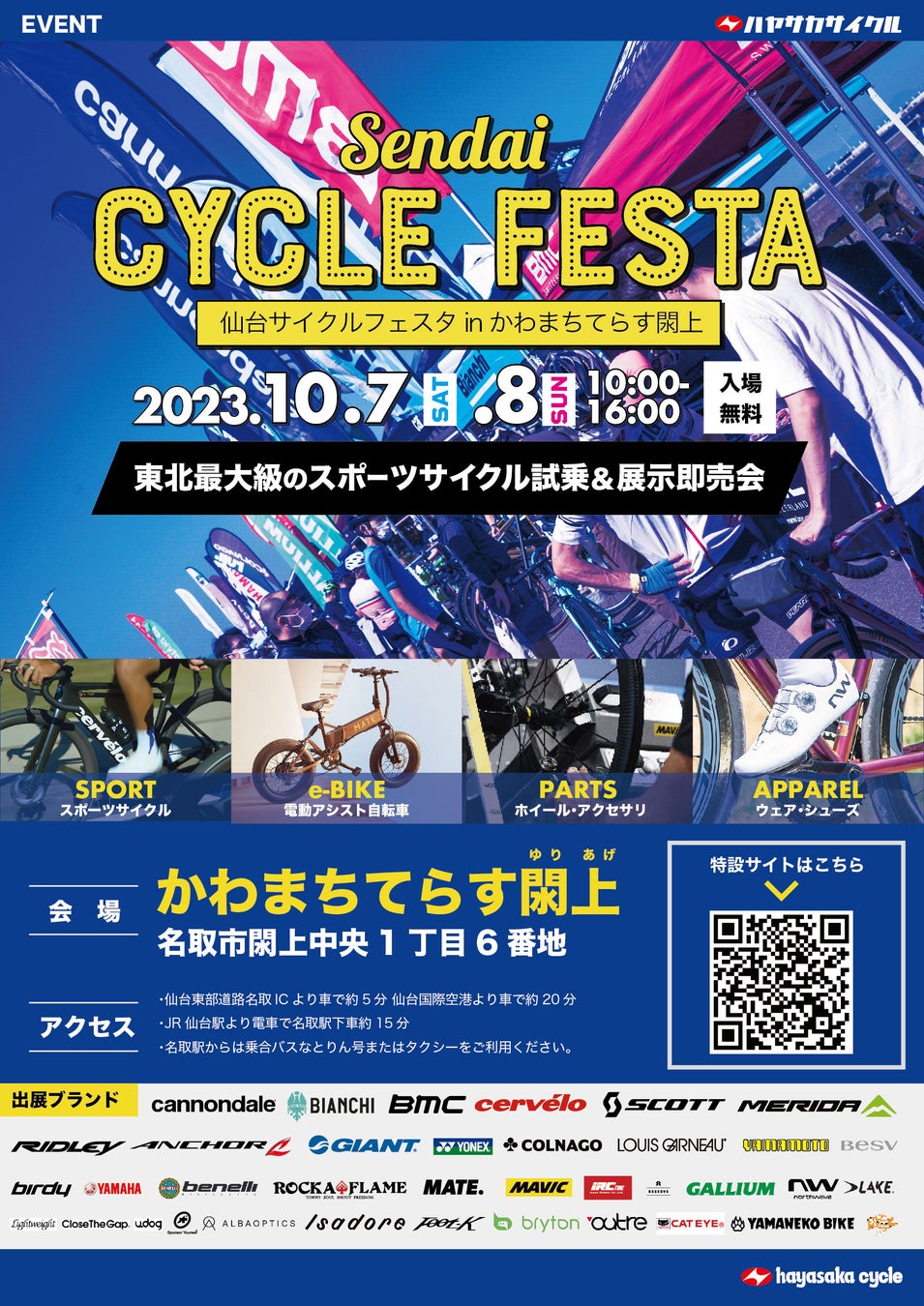 ハヤサカサイクルの取り扱いサイクルブランドの人気モデルが一堂に会する東北最大級のスポーツサイクルフェスティバル“仙台サイクルフェスタ2023 in かわまちてらす閖上(ゆりあげ)”が、いよいよ今年も10月7日(土)・8日(日)名取市閖上地区のかわまちてらす閖上にて開催される。同会場での開催としては今年で4回目を数える。