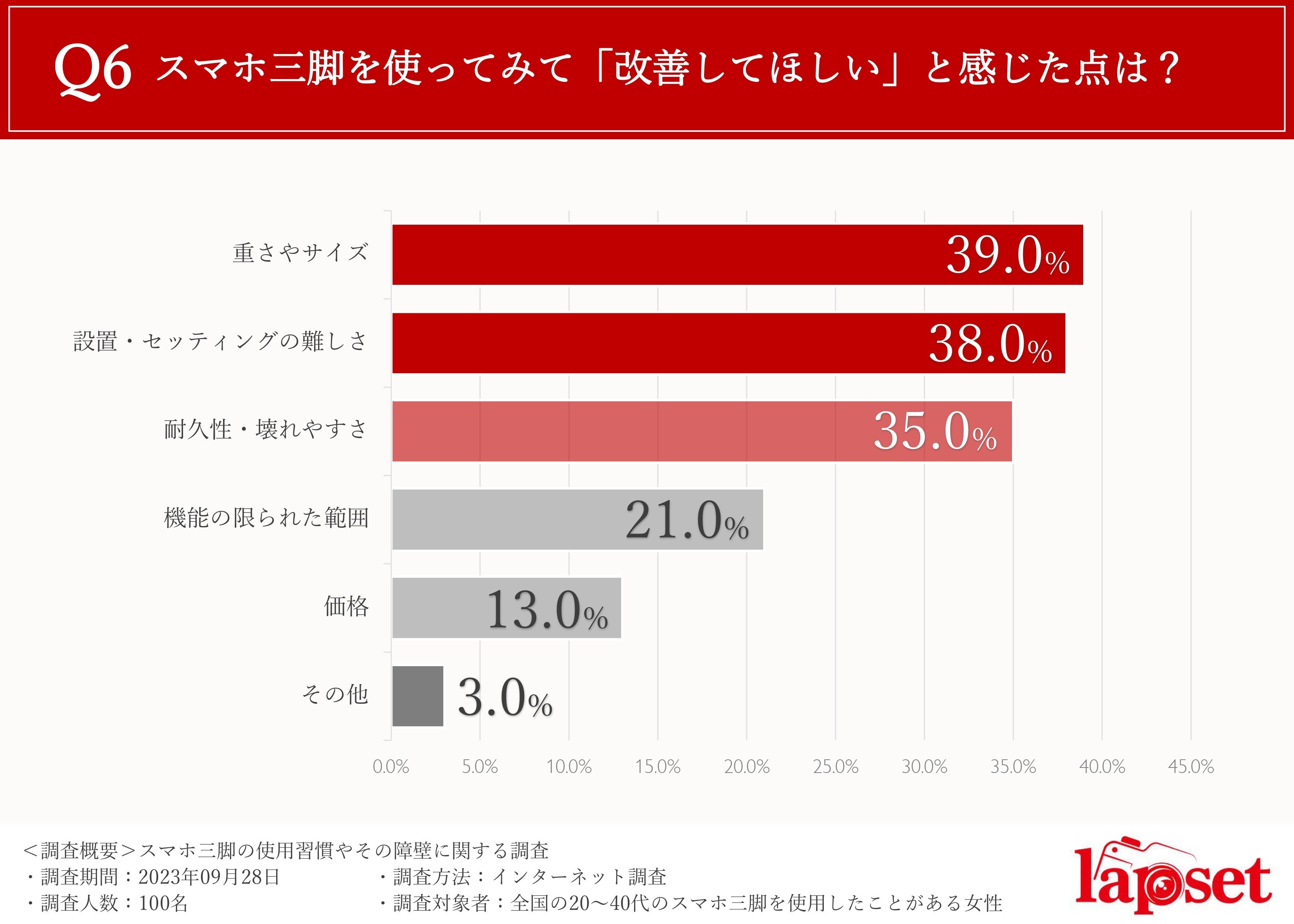 また、スマホ三脚を使用する中で改善してほしいと思う要素に「重さ」や「設置・セッティングの難しさ」が挙げられており、スマホ購入時に重要視するべきポイントになりそうです。